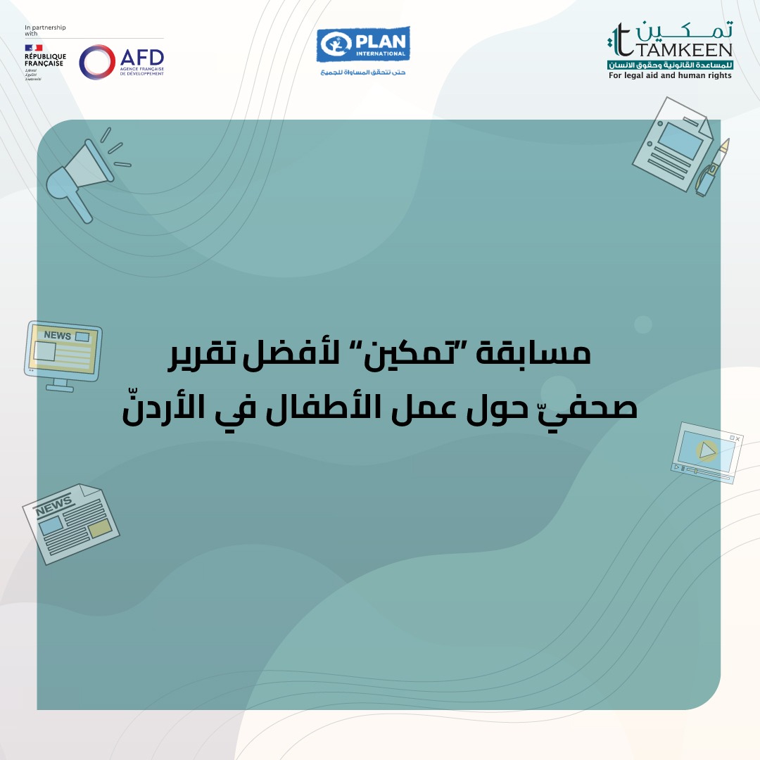 في إطار الجهود الرامية إلى تسليط الضوء على قضيّة عمل الأطفال في الأردنّ، تعلن "تمكين"بالتعاون مع بلان إنترناشونال الأردن، وضمن إطار مشروع مكافحة أسوأ أشكال عمالة الأطفال في الأردن (إشراق 3) وبتمويل من الوكالة الفرنسية للتنمية، عن إطلاق مسابقة أفضل تقارير صحفيّة تناولت عمل الأطفال في أيّ جانب من جوانبها.