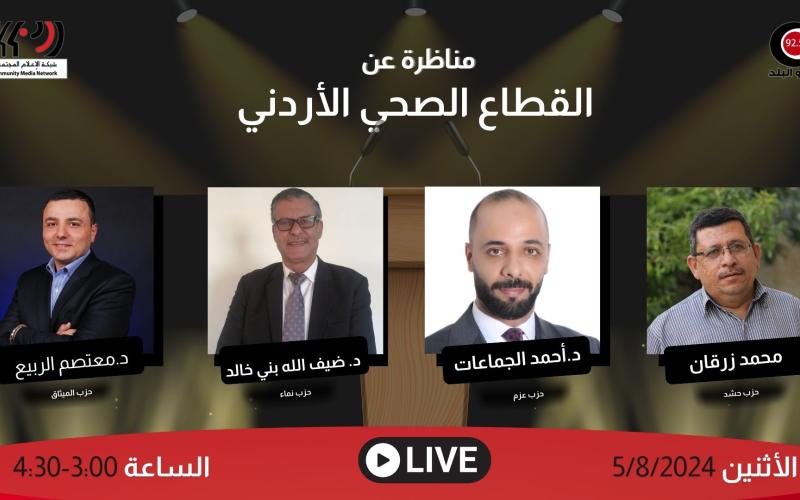 واستضافت المناظرة التي أدارها الصحفي محمد العرسان وبثت عبر تطبيق زووم، ممثلين عن الأحزاب السياسية، محمد زرقان من حزب حشد، أحمد الجماعات الأمين العام المساعد للشباب والرياضة، الدكتور ضيف الله بني خالد مساعد الأمين العام للشؤون الصحية والبيئية في حزب نماء، والدكتور معتصم فايز الربيع من حزب ميثاق.
