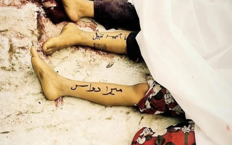 وتداول رواد مواقع التواصل الاجتماعي صورا تظهر جثامين أطفال صغار ارتقوا بقصف الاحتلال في غزة، توثق وجود أسمائهم مكتوبة بالحبر الأسود على أرجلهم، للتعرف عليهم وسط ساحة مليئة بالشهداء.
