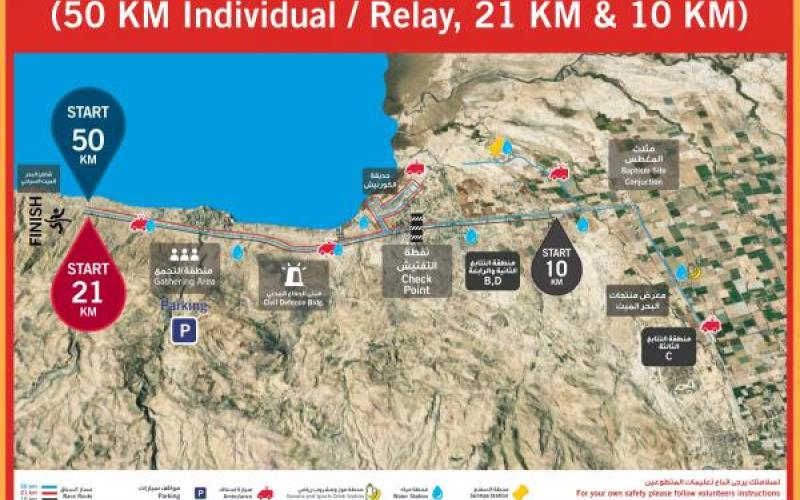 ويتضمن الحدث ثلاث سباقات رئيسية، حيث ينطلق سباقا 50 كم ألترا ماراثون (فردي/تتابع) و21 كم نصف ماراثون عند الساعة 6:00 صباحاً من مقابل شاطئ عمّان السياحي، فيما ينطلق سباق 21 كم لذوي الإعاقة عند الساعة 6:10 صباحاً من نفس الموقع، بينما ينطلق سباق 10 كم عند الساعة 9:00 صباحاً من بعد 2 كم من مثلث المغطس.