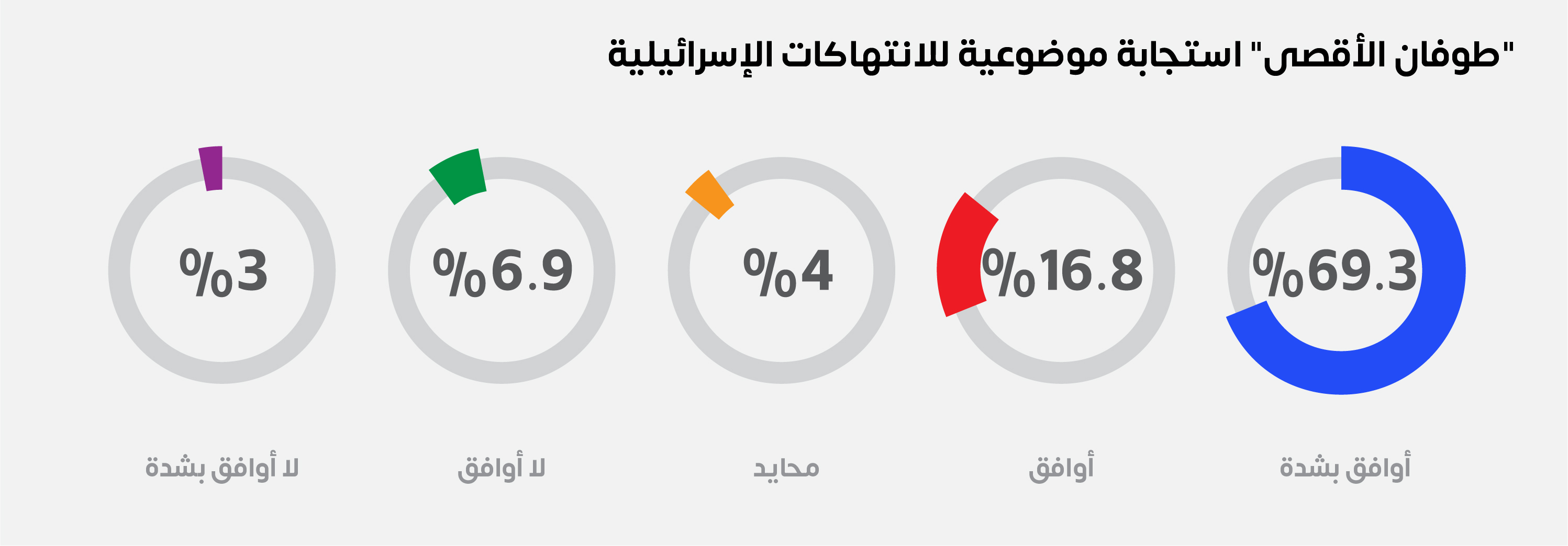 كشفت نتائج الاستطلاع أن ما نسبته (86.1%) من العينة ترى في عملية "طوفان الأقصى" استجابة موضوعية للانتهاكات الإسرائيلية، مقابل (9.9%) أعربوا عن عدم اتفاقهم مع ذلك، في حين أن (4%) فضلوا الحياد.