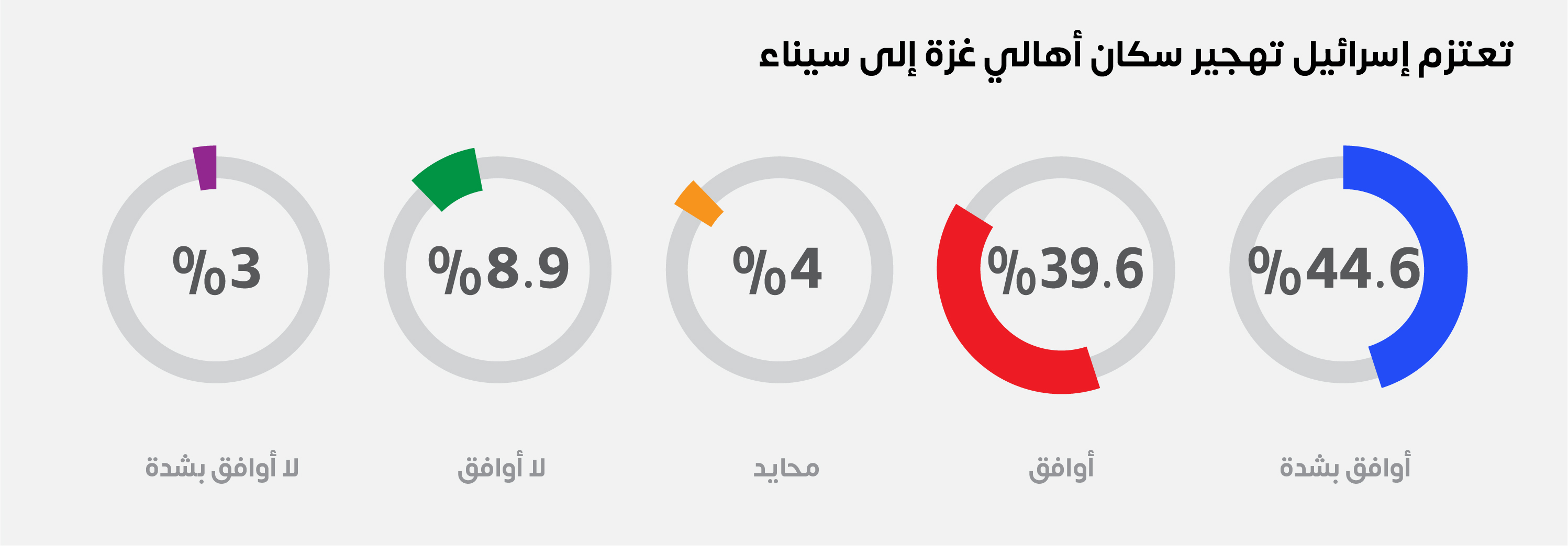 وفي سياق مماثل؛ تعتقد غالبية العينة (84.2%) أن إسرائيل تعتزم تهجير سكان أهالي غزة إلى سيناء، مقابل (11.9%) لا يعتقدون ذلك، في حين أن ما نسبته (4%) أجابوا بالحياد. كما يرى (56.4%) من العينة أن احتمالات توسع جبهات الحرب مرتفع جداً، مقابل (24.7%) يرون عكس ذلك، فيما فضل (18.8%) الإجابة بالحياد.