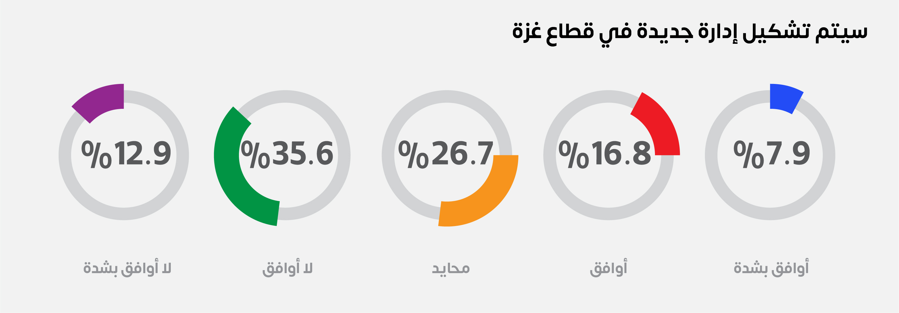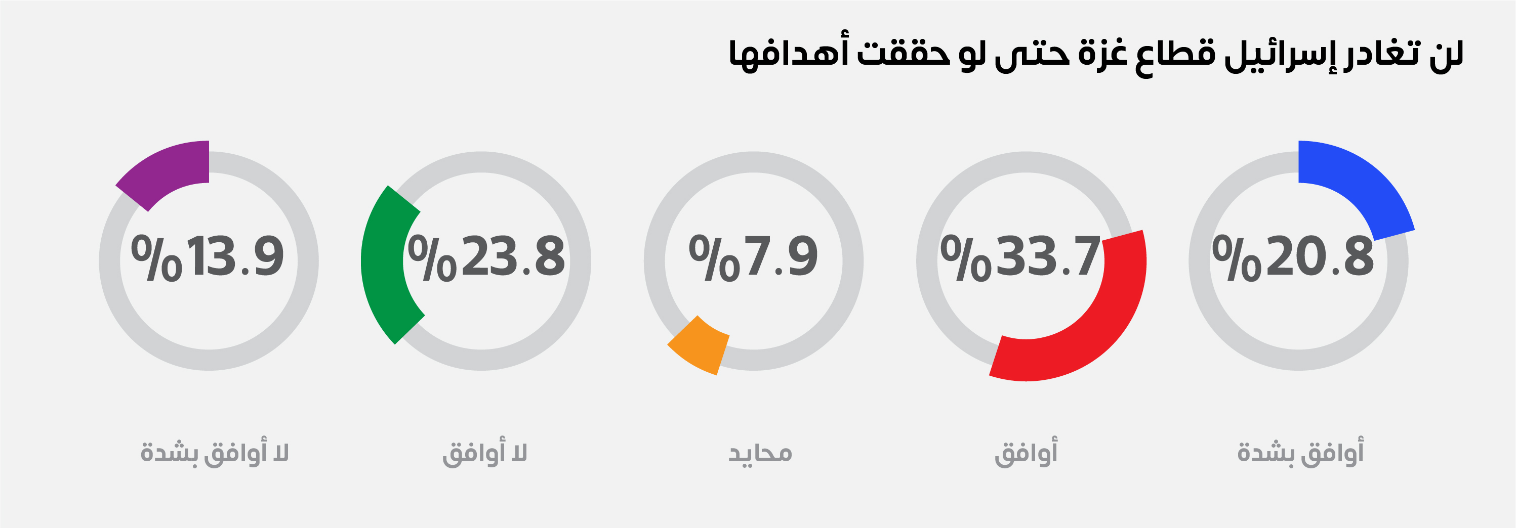 وبذات السياق، يعتقد (54.5%) من العينة أن إسرائيل لن تغادر قطاع غزة، حتى لو حققت أهدافها، في حين أن ما نسبته (37.7%) لا يتفقون مع إمكانية احتلال إسرائيل للقطاع، فيما فضل (7.9%) الحياد.