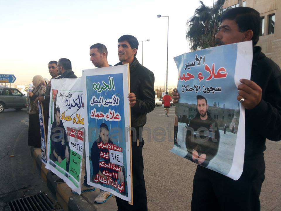 اعتصم العشرات من الناشطين وأهالي الأسرى الاردنيين في سجون الاحتلال الاسرائيلي عصر الإثنين للمطالبة أمام رئاسة الوزراء، استنكاراً لما اعتبروه "تجاهل الحكومة للأسير علاء حماد" الذي وصل باضرابه اليوم 216.