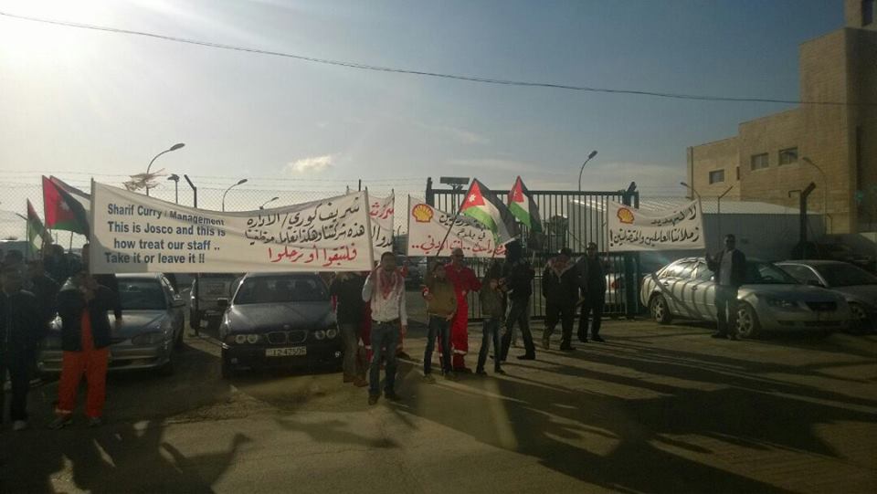 اعتصم العشرات من موظفي شركة الأردن للصخر الزيتي "جوسكو" اليوم الثلاثاء، احتجاجا على قرار الإدارة بفصل 83 عاملا من الشركة.