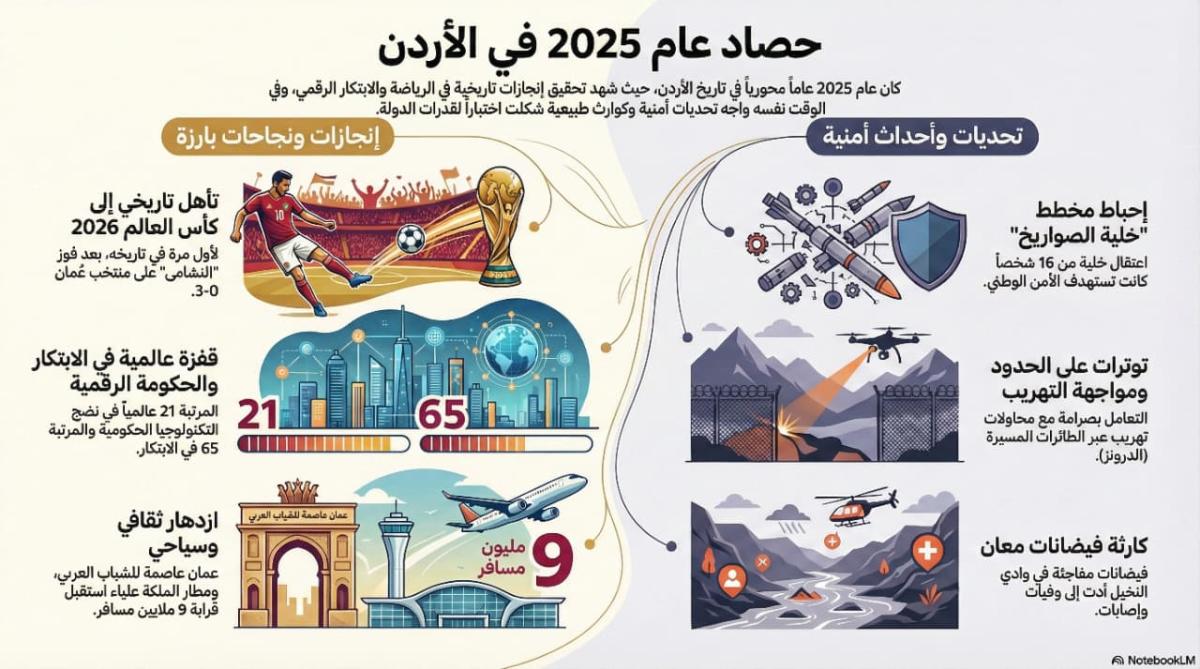 رغم غياب الأحداث السياسية الكبرى على الساحة الداخلية خلال عام 2025، إلا أن المشهد الأردني تأثر بشكل ملحوظ بتطورات أمنية متسارعة وتداعيات إقليمية ودولية انعكست على مختلف المستويات السياسية والاقتصادية والاجتماعية.