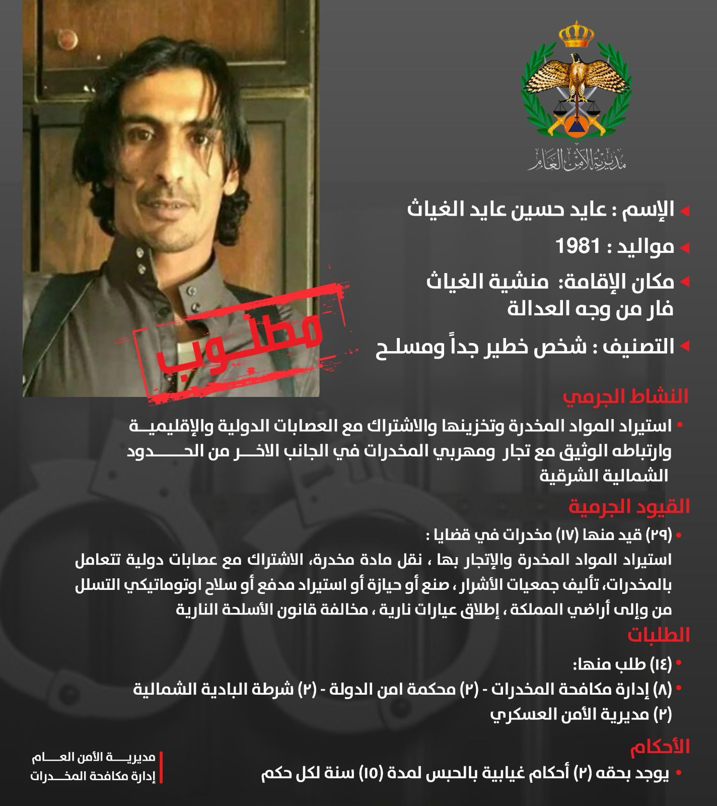 7. عايد حسين عايد الغياث / مواليد 1981م /مصنف بالخطر جدا والمسلح