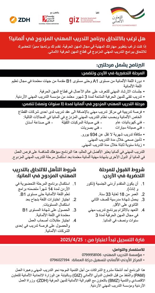 يُذكر أن هذا التعاون يأتي ضمن مشروع PAM (الشراكات من أجل التدريب الموجه للتنمية والهجرة العمالية)، الذي تنفذه GIZ الأردن بالنيابة عن وزارة التعاون الاقتصادي والتنمية الألمانية، ويعكس الالتزام المشترك بين الأردن وألمانيا بتطوير المهارات وفتح الفرص وبناء مستقبل مهني مستدام للشباب الأردني.