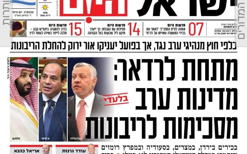 نشرت صحيفة "اسرائيل اليوم" المحسوبة على اليمين الاسرائيلي، خبرا على صفحتها الرئيسية تدعي فيه موافقة دول عربية خلف الكواليس على خطة الاحتلال الاسرائيلي لضم غور الأردن ومناطق شمال البحر الميت واراضٍ في الضفة الغربية.