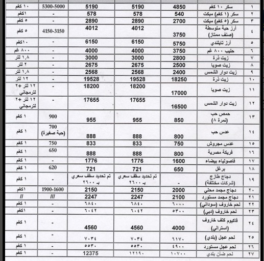 إلى ذلك، أصدرت وزارة الصناعة والتجارة والتموين النشرة الاسترشادية للسلع والتي تحتوي على سعر 27 مادة، والتي تظهر أسعار الجملة بالنسبة لتاجر التجزئة، والسعر الأعلى كسعر عادل للمستهلك، وأسعار المؤسسة المدنية للسلعة.