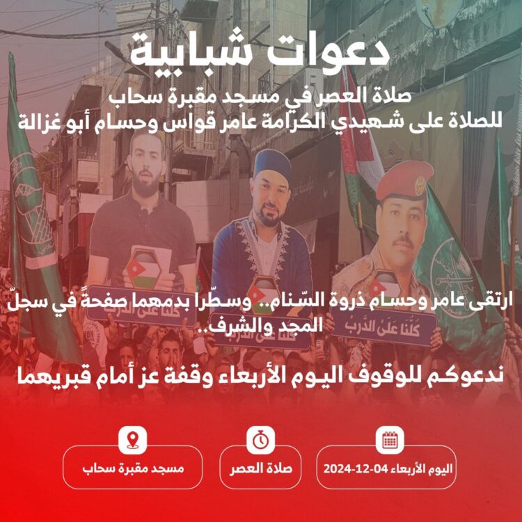 وجاء في دعوة تمّ تداولها على مواقع التواصل الاجتماعي: “ارتقى عامر وحسام ذروة السّنام.. وسطّرا بدمهما صفحةً في سجلّ المجد.. ندعوكم للوقوف وقفة عز أمام قبريهما اليوم الأربعاء 4-12-2024 صلاة العصر في مقبرة سحاب”.