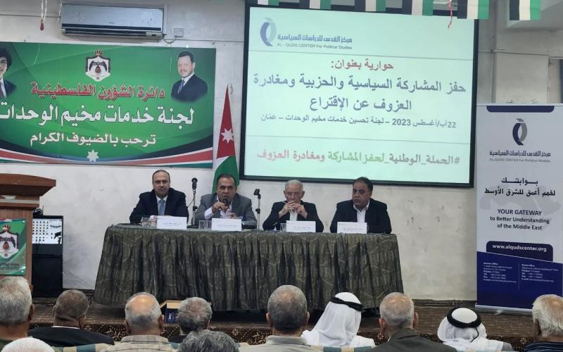 بمشاركة عشرات الوجهاء والناشطين والناشطات وقادة المجتمعين المحلي والمدني في الوحدات وقادة أحزاب سياسية وأعضاء في مجلس محافظة العاصمة ومجلس أمانة عمّان، وجهور كبير من أبناء مخيم الوحدات، نظّم مركز القدس للدراسات السياسية حوارية بعنوان: "حفز المشاركة السياسية ومغادرة العزوف عن الاقتراع"، بدأت بكلمة ترحيبية ألقاها الأستاذ عبد الفتاح الكوز رئيس لجنة تحسين خدمات مخيم الوحدات، وتحدث فيها معالي الدكتور محمد المومني أمين عام حزب الميثاق الوطني، وسعادة المهندس مازن ريال الأمين العام لحزب الإصلاح والتجديد "حصاد".