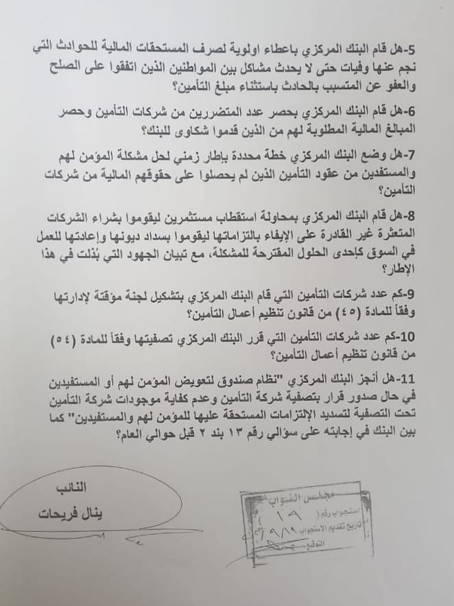 واستفسر النائب عن حلول البنك المركزي لهذه القضية وفي حال قام بحصر عدد المتضررين وقيمة المبالغ المالية المطلوبة وفي حال قام البنك بإعطاء أولوية بالتعويض لمن تعطلت أعمالهم بسبب التأخر بصرف مستحقاتهم وخاصة الذين تعتبر "المركبة" عنصر أساسي لعملهم، بالإضافة للحوادث التي نجم عنها وفيات حتى لا يحدث مشاكل بين المواطنين الذين اتفقوا على الصلح والعفو عن المتسبب بالحادث باستثناء مبلغ التأمين.