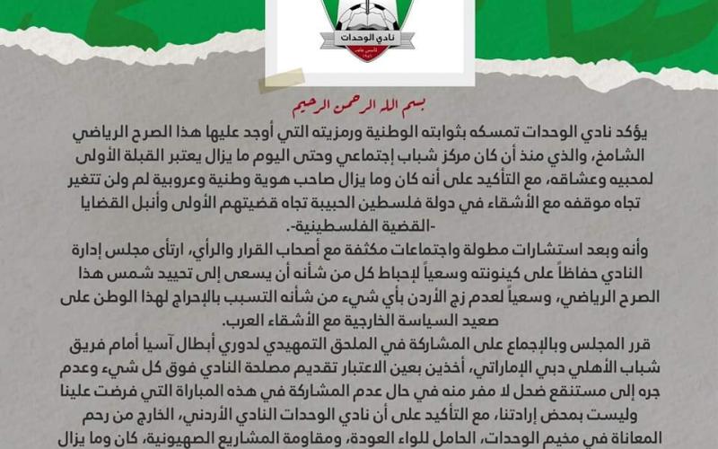وكانت إدارة الوحدات قد ترددت بشأن خوض المباراة بسبب ضم النادي الإماراتي للاعب يحمل جنسية الاحتلال الإسرائيلي، بالإضافة لخوض الفريق الإماراتي لمباراة ودية مع أحد أندية الاحتلال.