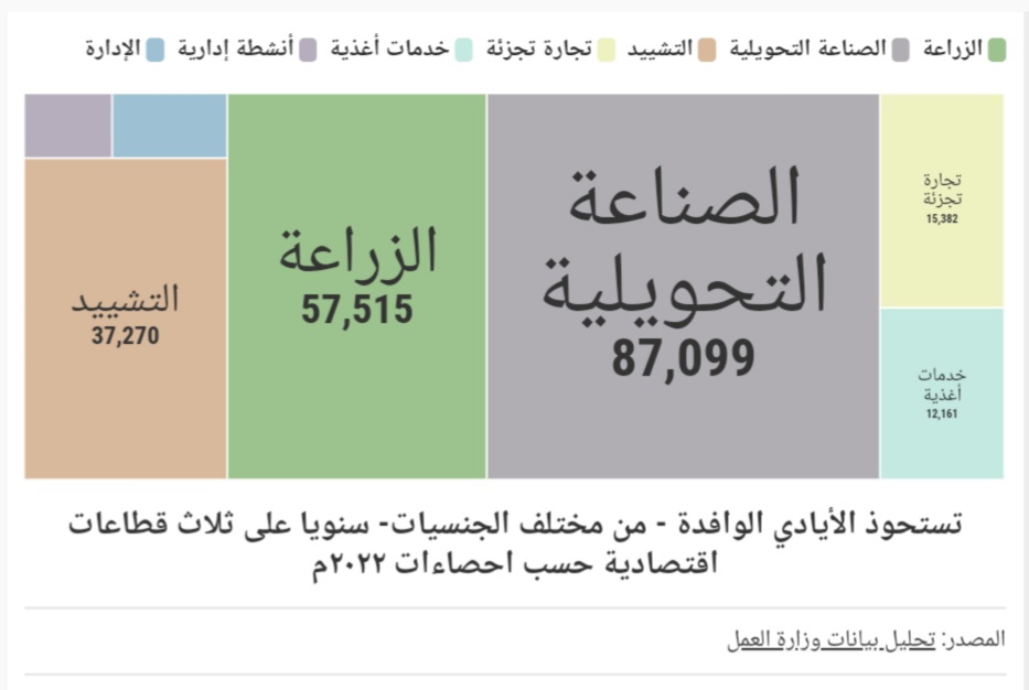 في تقرير إنجازات تفتيش العمل والسلامة المهنية الربع الثالث لعام 2022م وغيره لا ذكر لتصنيف جنسية العمالة الصادر بحقها مخالفة، إنما عموميات، وكانت على النحو: العمالة المخالفة سجل 4 عمال مضبوطين و9 ملغى تسفيرهم و3 أخلي سبيلهم بكفالة، و41 ملغى تسفيرهم بدفع غرامة، أما مؤشرات سوق العمل الوطنية السنوية، فتشير إلى أن نصف الأيدي العاملة من غير الأردنيين" ذكور" لخمس سنوات الماضية ، ولم تورد وزارة العمل نسبة الإناث للذكور من العمالة المصرية.