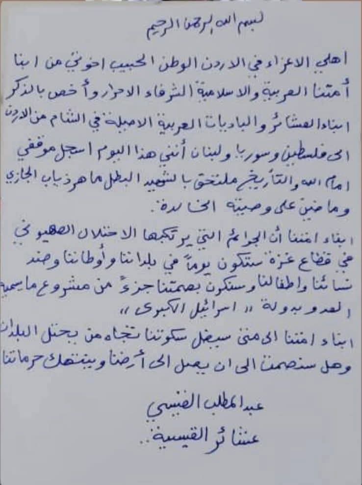 وجاء في الوصية التي خطها بيده، توجيه تحية إلى "الأردن الوطن العزيز، وإلى أبناء الأمة العربية والإسلامية الشرفاء"، مؤكداً أن موقفه يأتي امتداداً لتاريخ طويل من التضحيات من فلسطين وسوريا ولبنان. كما خصّ بالذكر الشهيد ماهر ذياب الجازي.
