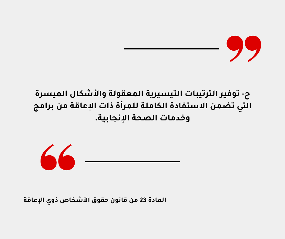 هذا ما يؤكده أيضا المتحدث الرسمي باسم المجلس المجلس الأعلى لحقوق الأشخاص ذوي الاعاقة رأفت الزيتاوي، إلى عدم توفر المرافق المناسبة، وعدم تقديم المعلومات بطريقة يمكن فهمها من قبل ذوي الإعاقة، وما يزيد الوضع سوءا، عدم احترام مبدأ الموافقة الحرة المستنيرة، حيث يتم تجاهل رأي الفتيات ذوات الإعاقة وعدم استفسارهن قبل أي إجراء طبي، ويكتفى بسؤال المرافقين حول أي موضوع يتعلق بهن.