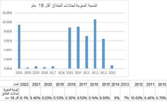 ويظهر الجدول نسب الطلاق لمن تزوجن قبل أن يبلغن 18 عاما خلال الفترة من (2010 – 2022)