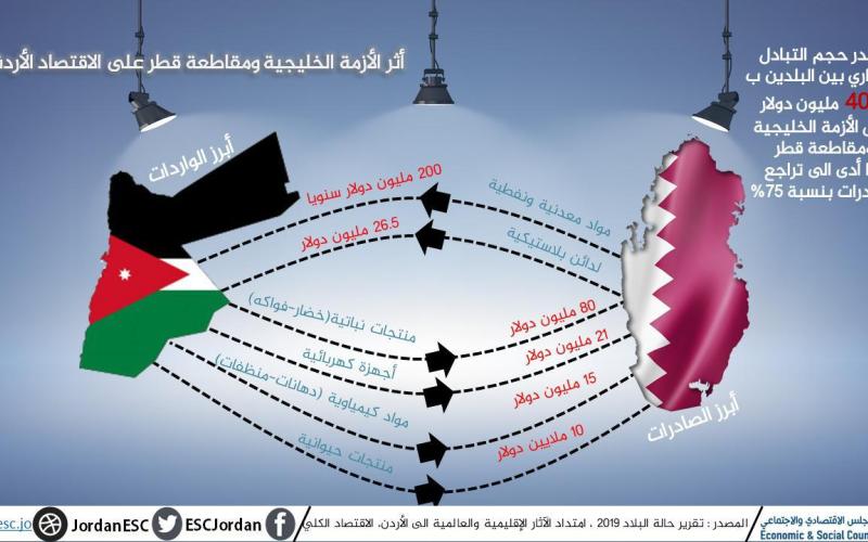 ورد في تقرير حالة البلاد 2019 الصادر عن المجلس الاقتصادي والاجتماعي أن الاقتصاد الأردني تأثر سلبا خلال أزمة مجلس التعاون الخليجي ومقاطعة قطر، اذ تراجعت الصادرات الأردنية التي كانت تصل الى قطر برا بنسبة تناهز 75%. وذكر التقرير ان الميزان التجاري بين البلدين يميل لصالح دولة قطر الشقيقة التي يستورد منها الأردن مدخلات انتاج معدنية وكيميائية في أصولها النفطية، والتي أدى انقطاعها الى خلق أزمة لدى المصانع الأردنية لحاجتها للبحث عن بدائل. وأضاف التقرير أن الأردن يستورد من قطَر مواد معدنية ونفطية بقيمة 200 مليون دولار سنوياً، ولدائن بلاستيكية بقيمة 26.5 مليون دولار، كما يصدّر الأردن سنوياً إلى قطَر منتجات نباتية من الخضراوات والفواكه بقيمة 80 مليون دولار، وأجهزة كهربائية بقيمة 21 مليون دولار، ومواد كيمياوية بقيمة 15 مليون دولار، ومنتجات حيوانية بقيمة 10 ملايين دولار.