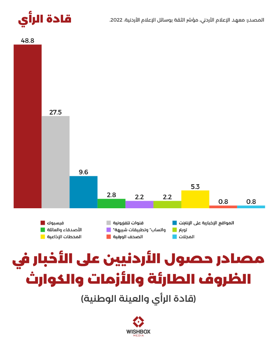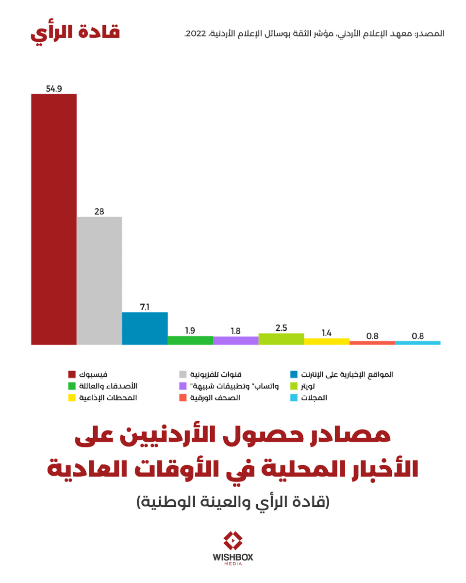 وحتى على المستوى الإقليمي العربي، يعد الأردنيون منذ سنوات ضمن الشعوب العربية الأكثر اعتماداً على وسائل التواصل الاجتماعي لتلقي الأخبار؛ إذ حلوا في تشرين الأول/أكتوبر 2019، بحسب الباروميتر العربي، في المركز الثالث بنسبة 47% (خلف الكويت 64%، وفلسطين 57)، مقارنة بنسبة 36% على مستوى المنطقة ككل.