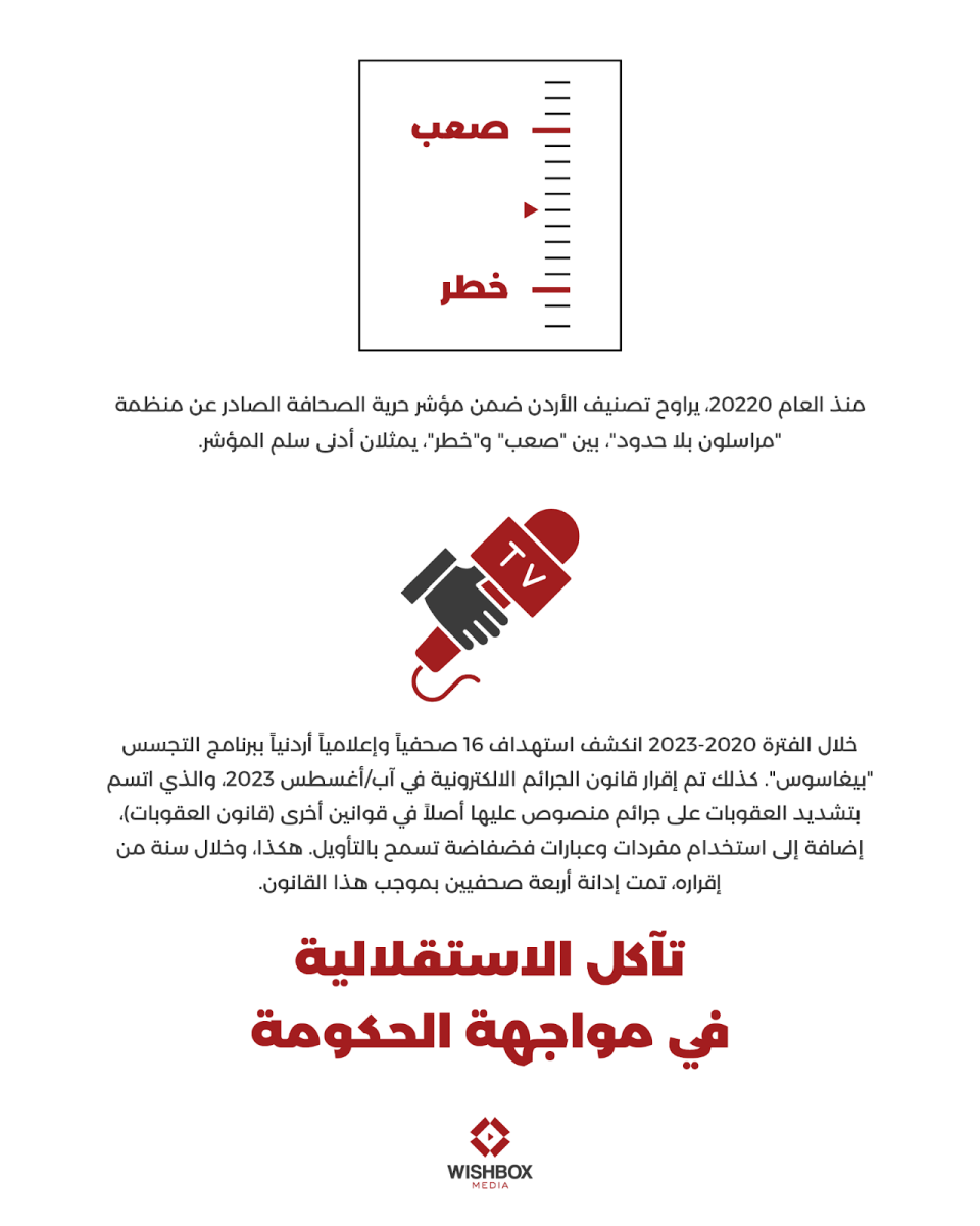 وغالباً ما يعزى ضعف الحريات الصحفية إلى قيود تشريعية وتهديدات أمنية تكبل العمل الصحفي المهني، يبدو من الواضح تزايدها في الفترة الأخيرة. إذ تبين، مثلاً، استهداف 16 صحفياً وإعلامياً أردنياً ببرنامج التجسس "بيغاسوس" خلال الفترة 2020-2023. وأهم من ذلك كان إقرار قانون الجرائم الالكترونية في آب/أغسطس 2023، والذي اتسم بتشديد العقوبات على جرائم منصوص عليها أصلاً في قوانين أخرى (قانون العقوبات)، إضافة إلى استخدام مفردات وعبارات فضفاضة تسمح بالتأويل. هكذا، وخلال سنة من إقراره، تمت إدانة أربعة صحفيين بموجب هذا القانون.