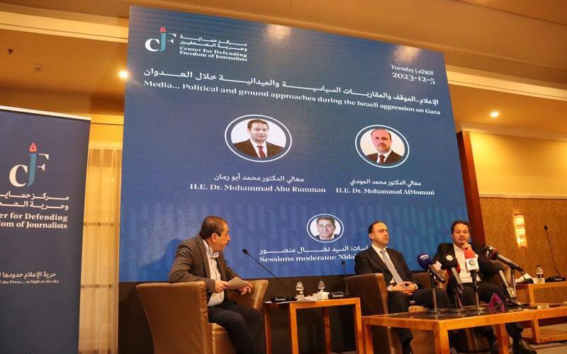 وفي الجلسة الأخيرة التي تحدث بها ناصر أبو بكر نقيب الصحفيين الفلسطينيين عبر كلمة مصورة، ووائل الدحدوح مدير مكتب الجزيرة في غزة عبر اتصال هاتفي، والدكتورة نهلة المومني من المركز الوطني لحقوق الإنسان، قال أبو بكر إن أكثر من 1200 صحفي وصحفية يعيشون دون مأوى في قطاع غزة، ويعملون تحت القصف، ونزحوا أكثر من مرة خلال العدوان، مضيفا أن هناك مشكلة كبيرة في توفير معدات السلامة المهنية.