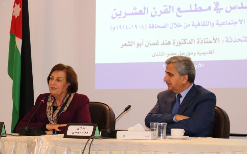 ألقت الأكاديمية والمؤرخة أ.د. هند أبو الشعر محاضرة في منتدى الفكر العربي، مساء يوم الأربعاء 29/1/2020، تحت عنوان "القدس في مطلع القرن العشرين" تناولت فيها الحياة الاجتماعية والثقافية والاقتصادية في مدينة القدس من خلال الصحافة العربية في الفترة 1908 – 1914، مبينةً أهمية القدس في عهد الدولة العثمانية التي جعلتها متصرفية تتبع مباشرة لعاصمة الدولة ويرتبط متصرفها برئيس مجلس الوزراء؛ ومشيرةً إلى أن هذا التغيير الإداري كان له علاقة بتوسع الامتيازات الأجنبية في المدينة المقدسة ، وكذلك ببداية الهجرة الصهيونية إلى فلسطين.