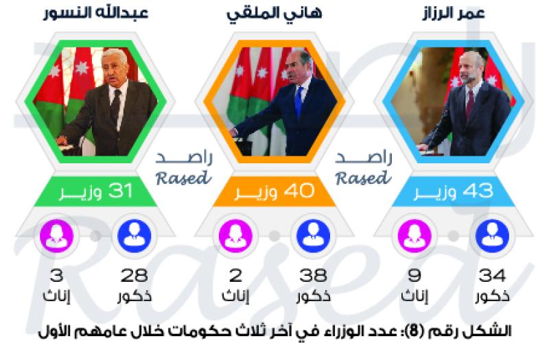 - حكومة الرزاز الأعلى عدداً في الوزراء في عامها الأول مقارنةً بآخر ثلاث حكومات.