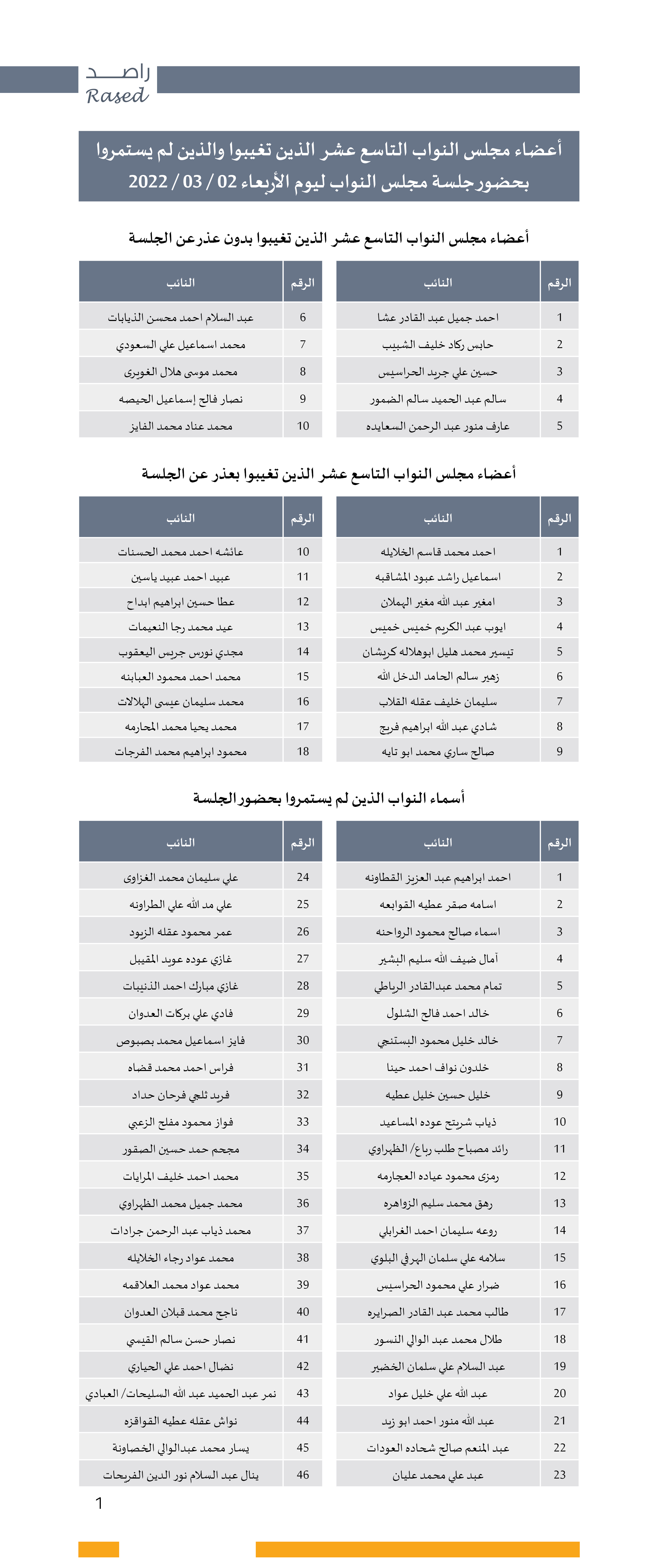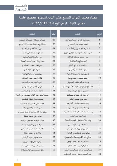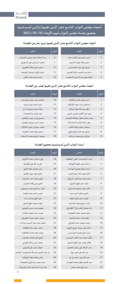وينشر راصد أسماء البرلمانيين والبرلمانيات الذي استمروا في الجلسة التي عقدت اليوم الأربعاء الموافق ٢ – ٣ -٢٠٢٢ وأسماء النواب الذين لم يستمروا بحضور الجلسة وأسماء النواب المتغيبين بعذر وأسماء النواب المتغيبين بدون عذر من خلال الجداول المرفقة.