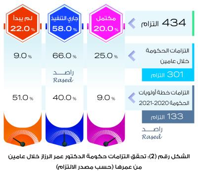 أظهرت نتائج التقرير أن الحكومة التزمت ب 434 التزاماً خلال عامين، 213 منها التزمت بهم في خطة النهضة 2019-2020، 88 التزام التزم بها رئيس الوزراء خلال تصريحات ومقابلات اعلامية ولقاءات نيابية ونقابية و133 التزاماً وردوا في خطة أولويات الحكومة 2020-2021، وبالنظر الى نسب تحقق الالتزامات خلال عامين بين التقرير أن 20% من مجموع الالتزامات تحقق بشكل كامل و58% جاري تنفيذه و22% من الالتزامات لم يبدأ تنفيذها، وبين التقرير أنه وبالنظر لالتزامات الحكومة التي صدرت قبل إطلاق خطة اولويات الحكومة 2020-2021 والبالغ عددها 301 إلتزام تظهر النتائج أن 25% منها تحقق بشكل كامل و66% جاري تنفيذه و9% منها لم يبدأ العمل به بعد مرور عامين، وبين التقرير أن 15% من التزامات خطة اولويات الحكومة 2020-2021 هي التزامات بدأ العمل بها وبعضها مكتمل قبل إطلاق الخطة وتساءل التقرير عن الغاية من وضع هذه الالتزامات في الخطة رغم بدء تنفيذها بشكل سابق للخطة.