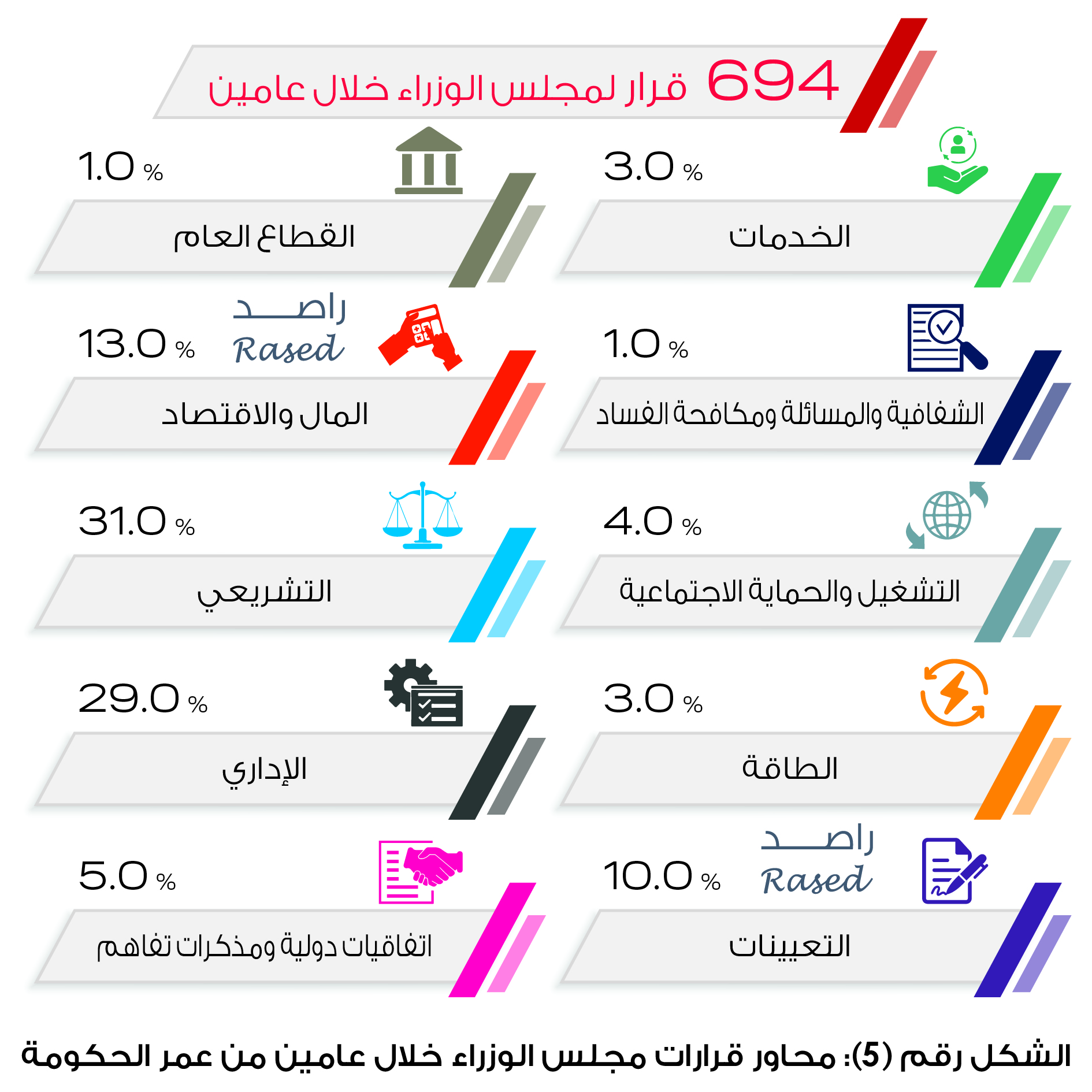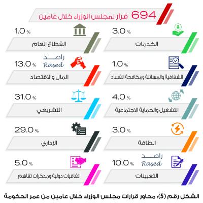 694قراراً أصدرها مجلس الوزراء خلال عامين 31% منها تتعلق بالمحور التشريعي و 29% قرارات إدارية.