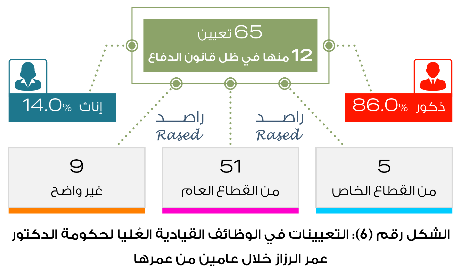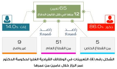 وبين التقرير أن مجلس الوزراء أصدر قرارات بتعيين 65 شخصاً في مناصب قيادية عليا خلال عامين 86% منهم ذكوراً و14% إناث، كان من ضمن هذه التعيينات 12 تعييناً صدروا في ظل العمل بقانون الدفاع.