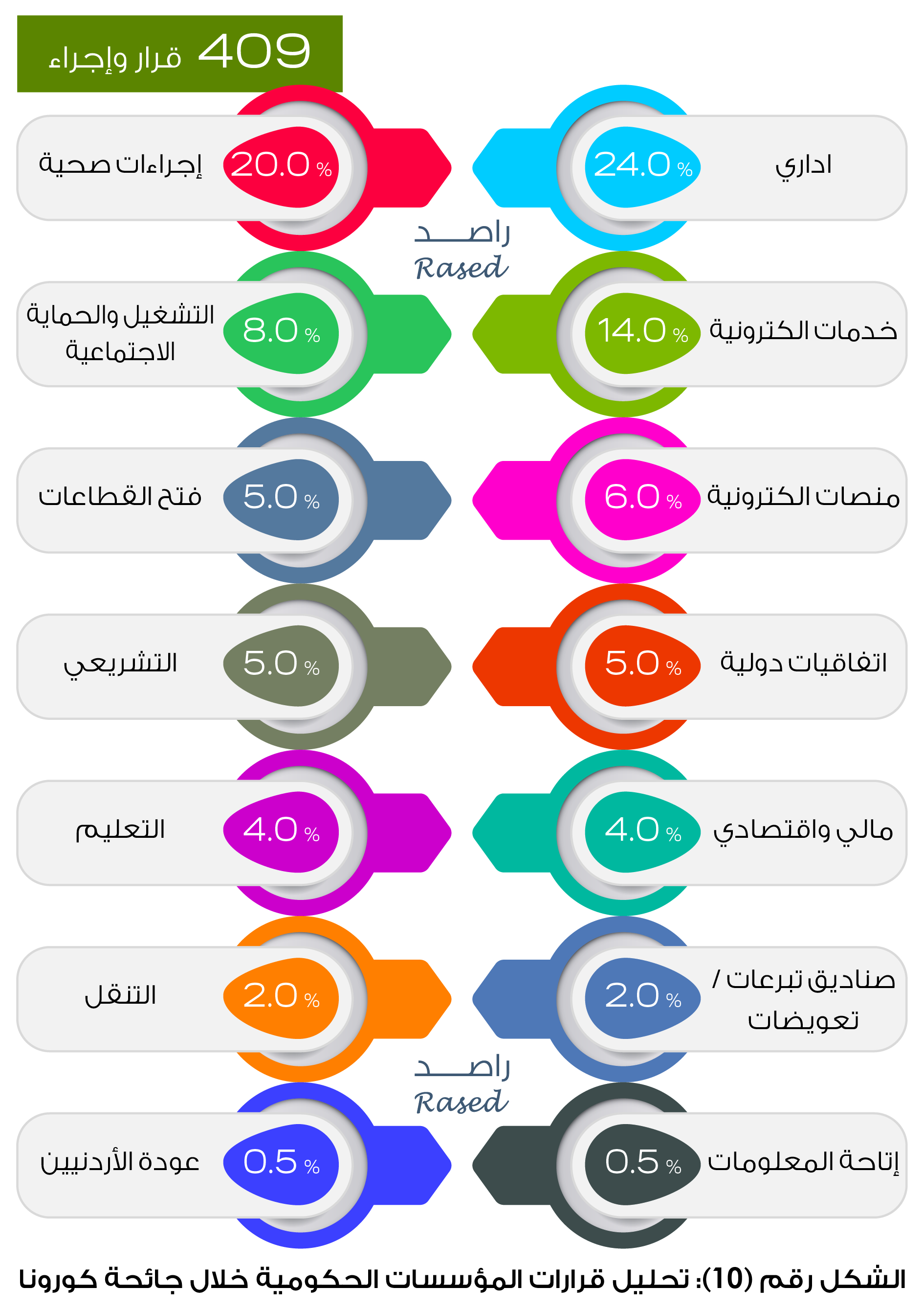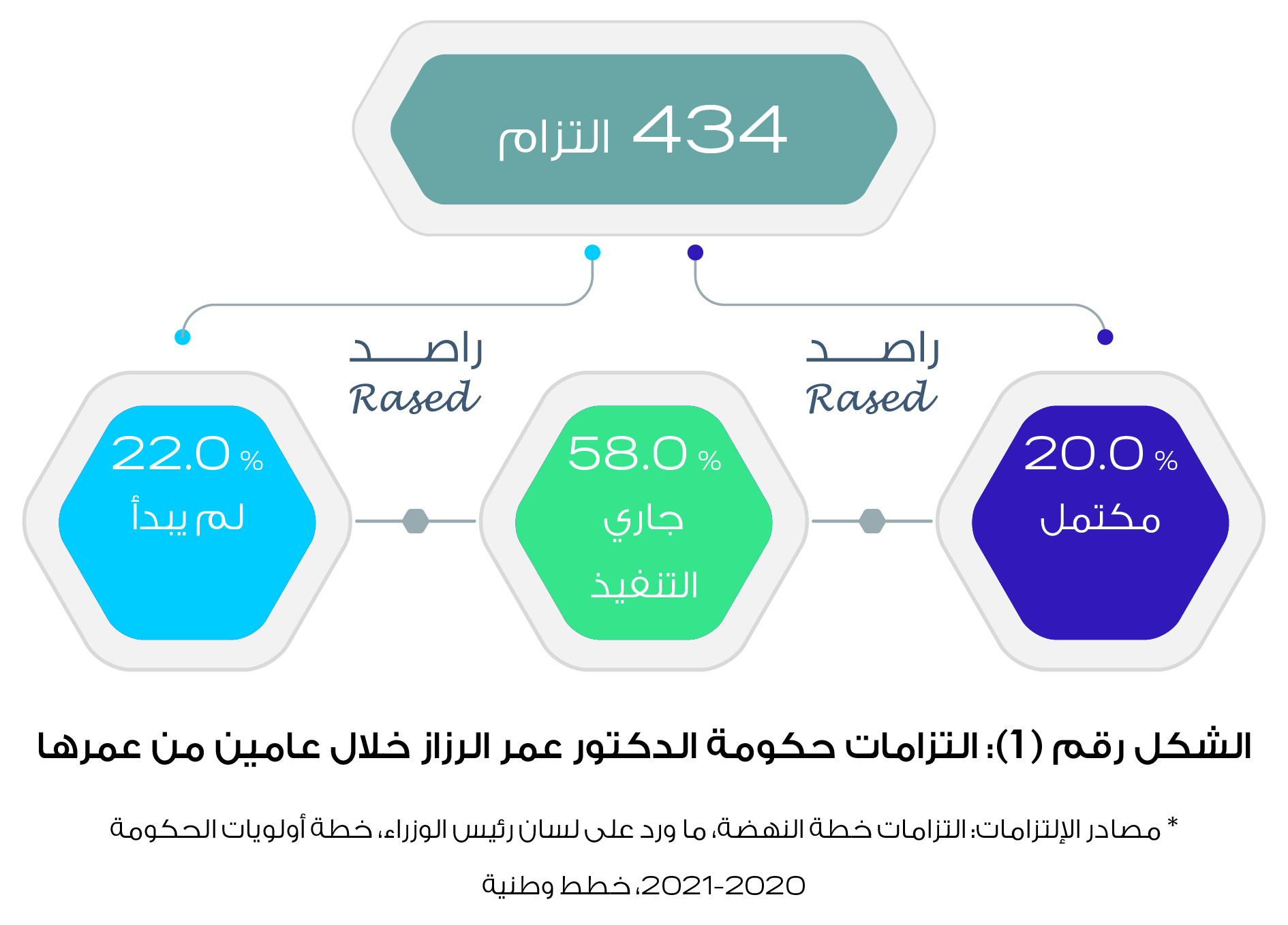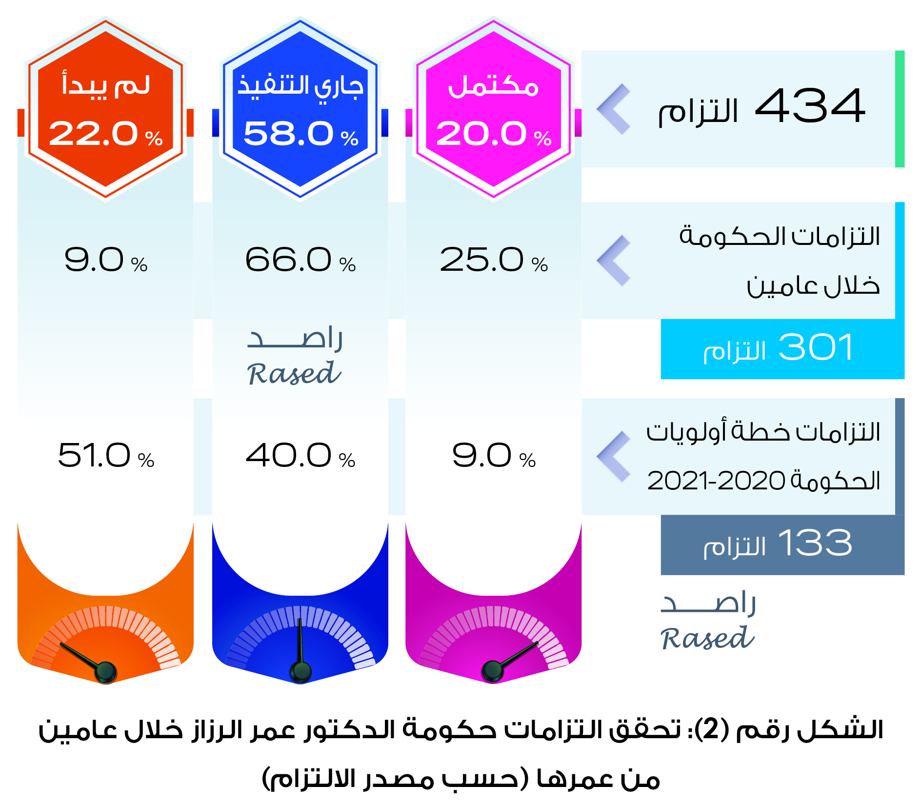 أطلق راصد لمراقبة الأداء الحكومي تقريره الخاص بمراقبة أداء حكومة الدكتور عمر الرزاز خلال عامين من عمرها وثلاثة أشهر على العمل بقانون الدفاع شمل الفترة منذ تولي الحكومة سلطاتها الدستورية في 14/6/2018 ولغاية 14/6/2020، حيث تضمن التقرير تتبعاً للالتزامات الحكومية خلال عامين ومدى تنفيذها وتم تقسيم درجات تحقق الالتزامات الى تحقق بشكل كامل، جاري تنفيذه ولم يبدأ، كما تضمن التقرير حصراً لقرارات مجلس الوزراء خلال عامين وتصنيفها الى محاور، إضافة لحصر أوامر الدفاع وقرارات الحكومة خلال جائحة كورونا ويقدم التقرير أيضاً تعداداً كمياً لسفر رئيس الوزراء والوزراء خلال عامين بالاستناد إلى الجريدة الرسمية كمرجعاً للمعلومات، وحصر التعيينات الحكومية في الوظائف القيادية العليا خلال عامين، المنصات والتطبيقات الالكترونية التي اطلقتها الحكومة للتعامل مع جائحة كورونا، اللجان التي شكلها مجلس الوزراء خلال عامين إضافة لتتبع أداء الحكومة في إدارة صندوق همة وطن وحساب وزارة الصحة وحساب الخير ومدى امتثالها لأوامر الدفاع.