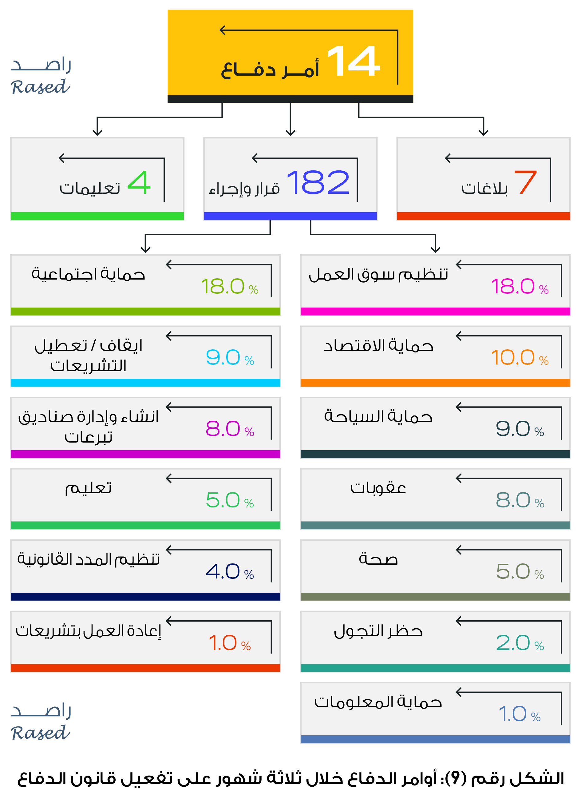 راصد: 14 أمر دفاع خلال ثلاثة أشهر تضمنت 182 قراراً وإجراء.