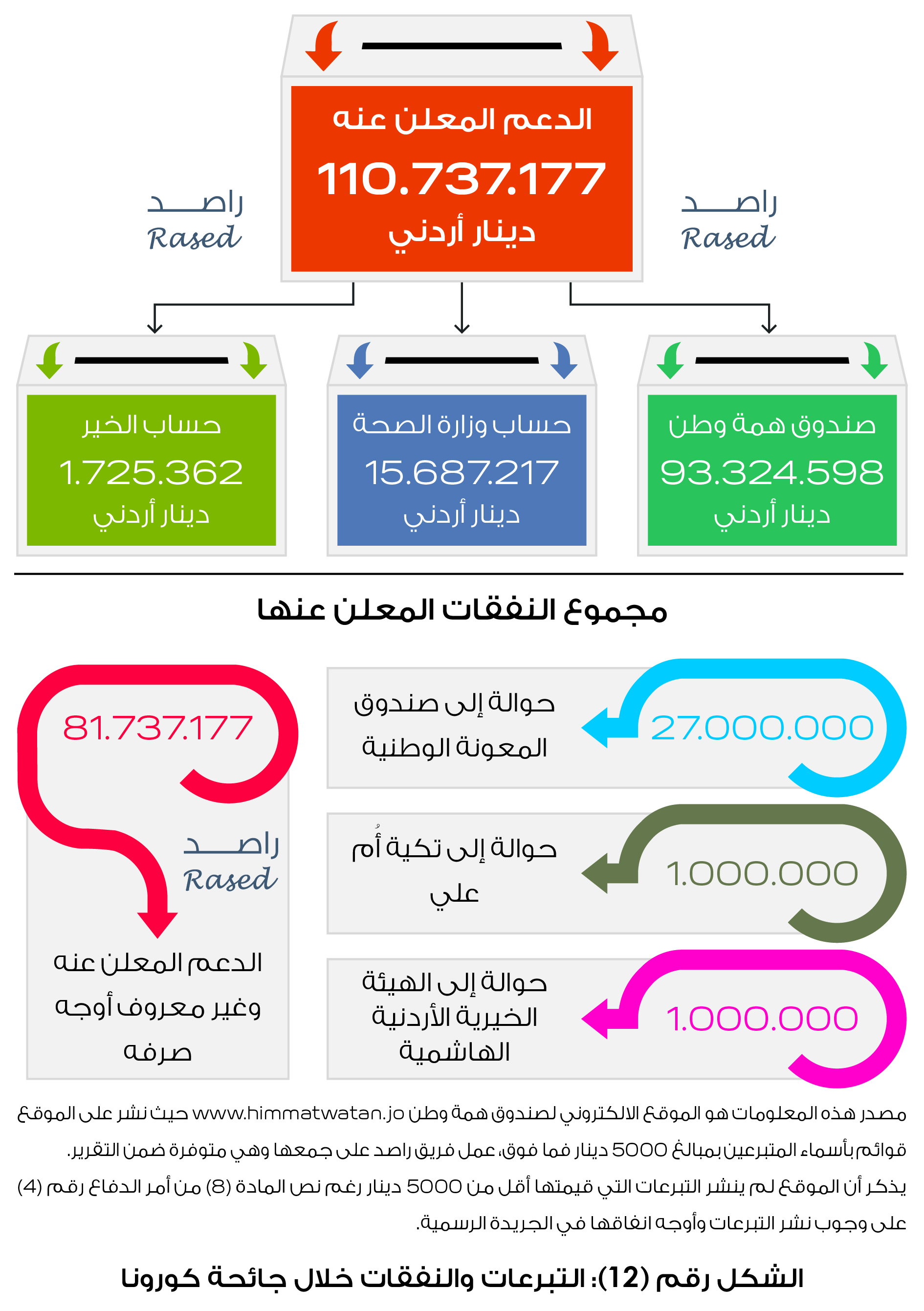 كما تضمن التقرير باباً خاصاً لتتبع الصناديق والحسابات التي أطلقتها الحكومة لجمع التبرعات خلال أزمة كورنا وهي صندوق همة وطن وحساب وزارة الصحة وحساب الخير التابع لوزارة التنمية الاجتماعية واعتمد التقرير على المعلومات المنشورة في الجريدة الرسمية وعلى الموقع الالكتروني لصندوق همة وطنwww.himmatwatan.jo ، ولدى تصفح الموقع لغاية تاريخ 21/6/2020 تبين أن مجموع الدعم الوارد للحسابات الثلاث هو 110,737,177دينار منها 93,324,598دينار دعم لصندوق همة وطن و 15,687,217دينار دعم لحساب وزارة الصحة و 1,725,362دينار دعم لحساب الخير، وبالنظر لما أنفقته الحكومة من هذه التبرعات، نُشر على موقع همة وطن أن اللجنة المكلفة بإدارة الصندوق أنفقت ما يلي: 27 مليون دينار حوالة إلى صندوق المعونة الوطنية، ومليون دينار حوالة إلى تكية أم علي ومليون دينار للهيئة الخيرية الأردنية الهاشمية ولدى تحليل التبرعات والنفقات المعلنة من قبل الحكومة على موقع همة وطن تبين أن هنالك أكثر من 81 مليون دينار معلن عنها كدعم وارد للحسابات وغير معروف فيما إذا تم إنفاقها وما هي أوجه الانفاق، وبين التقرير أن الحكومة لم تمتثل للبند (8) من أمر الدفاع رقم (4) لسنة 2020 والذي نص على وجوب نشر أسماء المتبرعين والمبالغ المودعة في الحسابات والمبالغ المصروفة وأوجه صرفها في الجريدة الرسمية، وينوه التقرير أن الحكومة لم تنشر أي تبرعات أقل من 5000 دينار في كافة الحسابات وطالب التقرير ضرورة توخي الشفافية من قبل الحكومة ونشر كافة التبرعات مهما كانت قيمتها امتثالاً لأمر الدفاع رقم (4).
