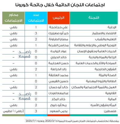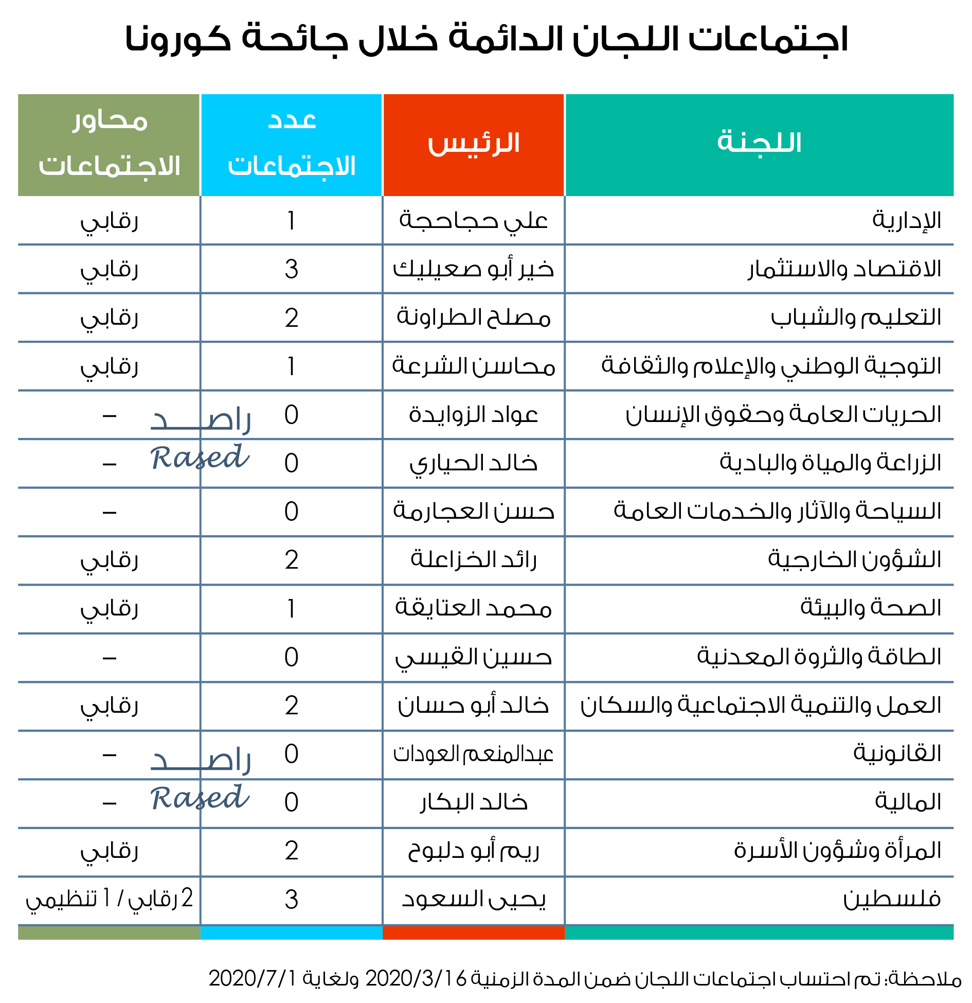 أما بما يتعلق بأداء اللجان الدائمة، يبين التقرير أن لجان المجلس عقدت ما مجموعه 17اجتماعاً خلال جائحة كورونا، حيث عقدت لجنة الاقتصاد والاستثمار ولجنة فلسطين 3اجتماعات لكل منها، فيما عقدت لجنة التعليم والشباب ولجنة الشؤون الخارجية ولجنة العمل والتنمية ولجنة المرأة وشؤون الأسرة اجتماعين لكل منهم، فيما لم تعقد 5لجان نيابية دائمة أي اجتماع خلال جائحة كورونا.