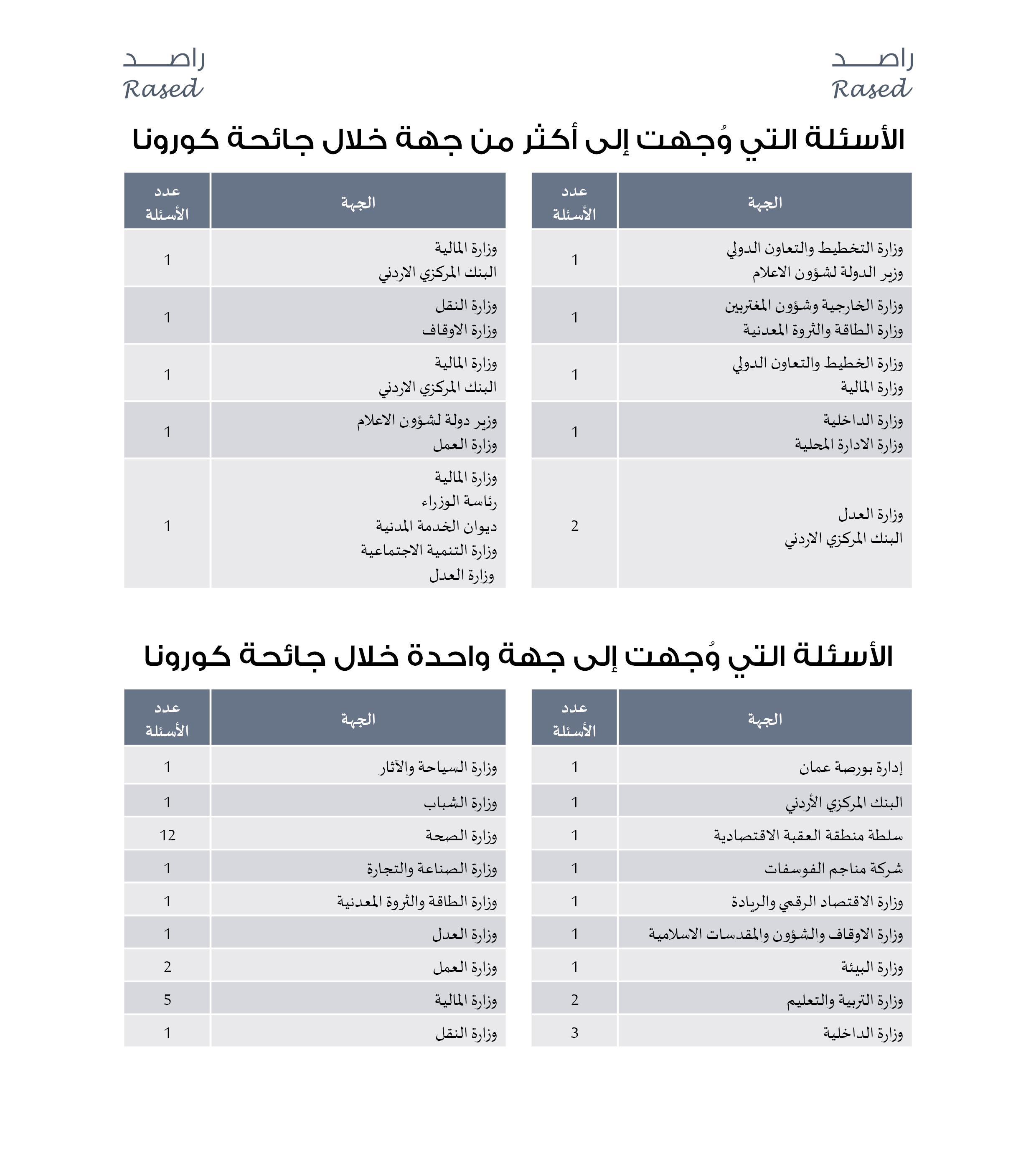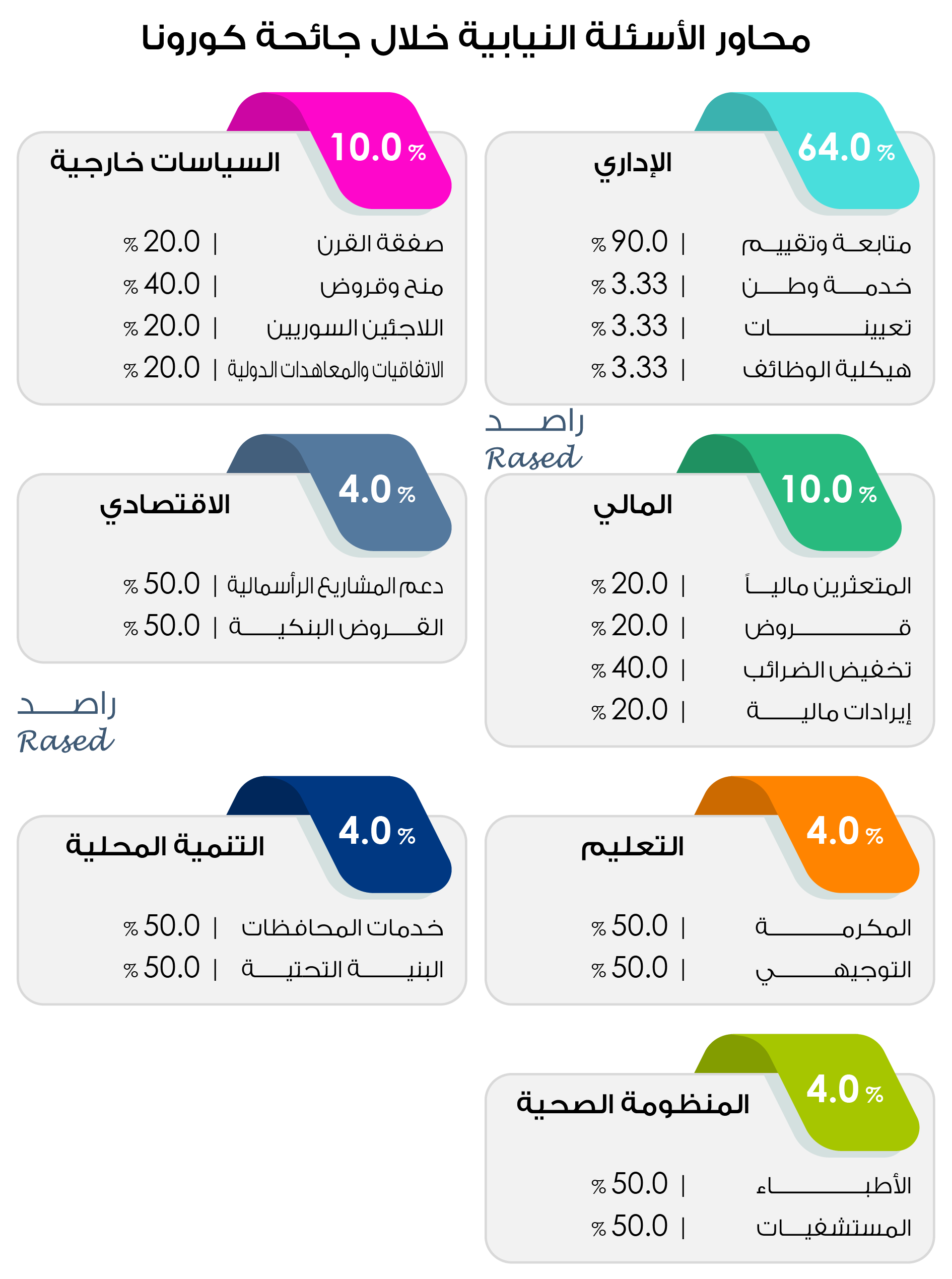 وبينت نتائج التقرير أن مجلس النواب قدم خلال الجائحة 48سؤالاً نيابياً قدمت من قبل 14برلماني وبرلمانية، فيما بلغت نسبة الإجابة على الأسئلة 35%من مجموع الأسئلة التي تم تقديمها، وتم توزيع الأسئلة حسب محاورها الرئيسية حيث تبين أن المحور الإداري حاز على 63%من مجموع الأسئلة المقدمة، تلاها الأسئلة المتعلقة بمحور السياسات الخارجية والمالية بنسبة وصلت إلى 5%من مجموع الأسئلة، وعلى صعيد الجهات التي وجهت لها الأسئلة تظهر النتائج أن وزارة الصحة كانت الجهة الأكثر استقبالاً للأسئلة النيابية بعدد أسئلة وصل إلى 12سؤالاً، تلتها وزارة المالية بـ 5أسئلة نيابية.