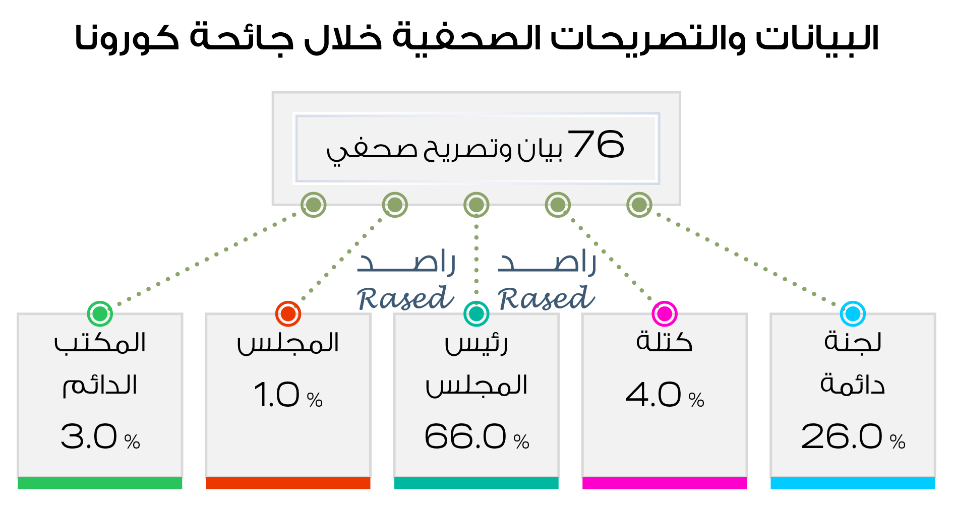 وعلى صعيدٍ متصل تتبع فريق إعداد التقرير البيانات والتصريحات الصحفية التي صدرت خلال فترة الجائحة حيث تبين أن عددها وصل إلى 76تصريح وبيان، 66%منها صدروا من رئيس مجلس النواب 26%منها صدروا من اللجان النيابية الدائمة و4%من الكتل البرلمانية و3%من المكتب الدائم لمجلس النواب و1%من المجلس.