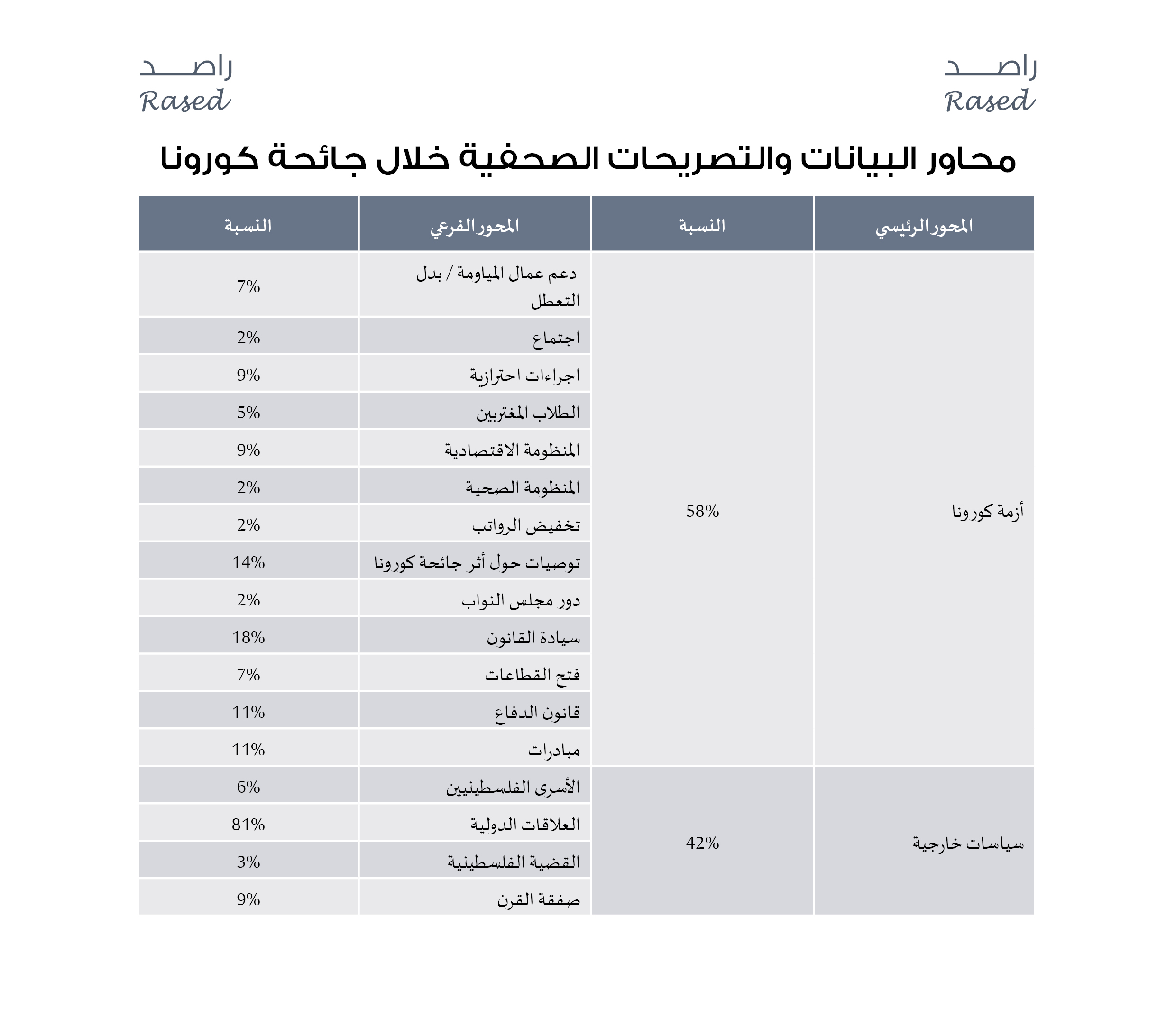 وبخصوص محاور البيانات والتصريحات الصحفية فقد تم توزيعهم إلى محورين أساسين وهما أزمة كورونا الذي حاز على 58%منها، والمحور الآخر السياسات الخارجية والذي حاز على 42%من التصريحات والبيانات.