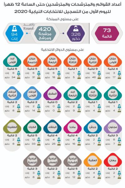 وسجل لغاية الساعة 12 ظهراً 73 قائمة انتخابية في جميع الدوائر الانتخابية، ما عدا دائرة المفرق الانتخابية التي لم يسجل فيها أي قائمة حتى 12 ظهراً، وتبين أن عمان الثانية سجل بها 9 قوائم انتخابية تلهتا دائرة اربد الأولى بـ 6 قوائم انتخابية.