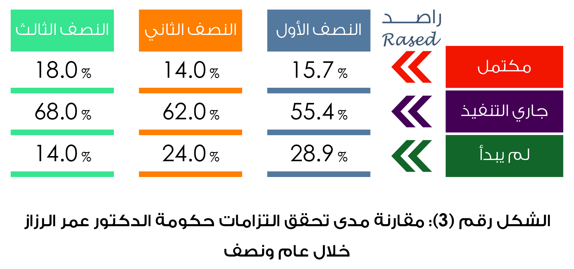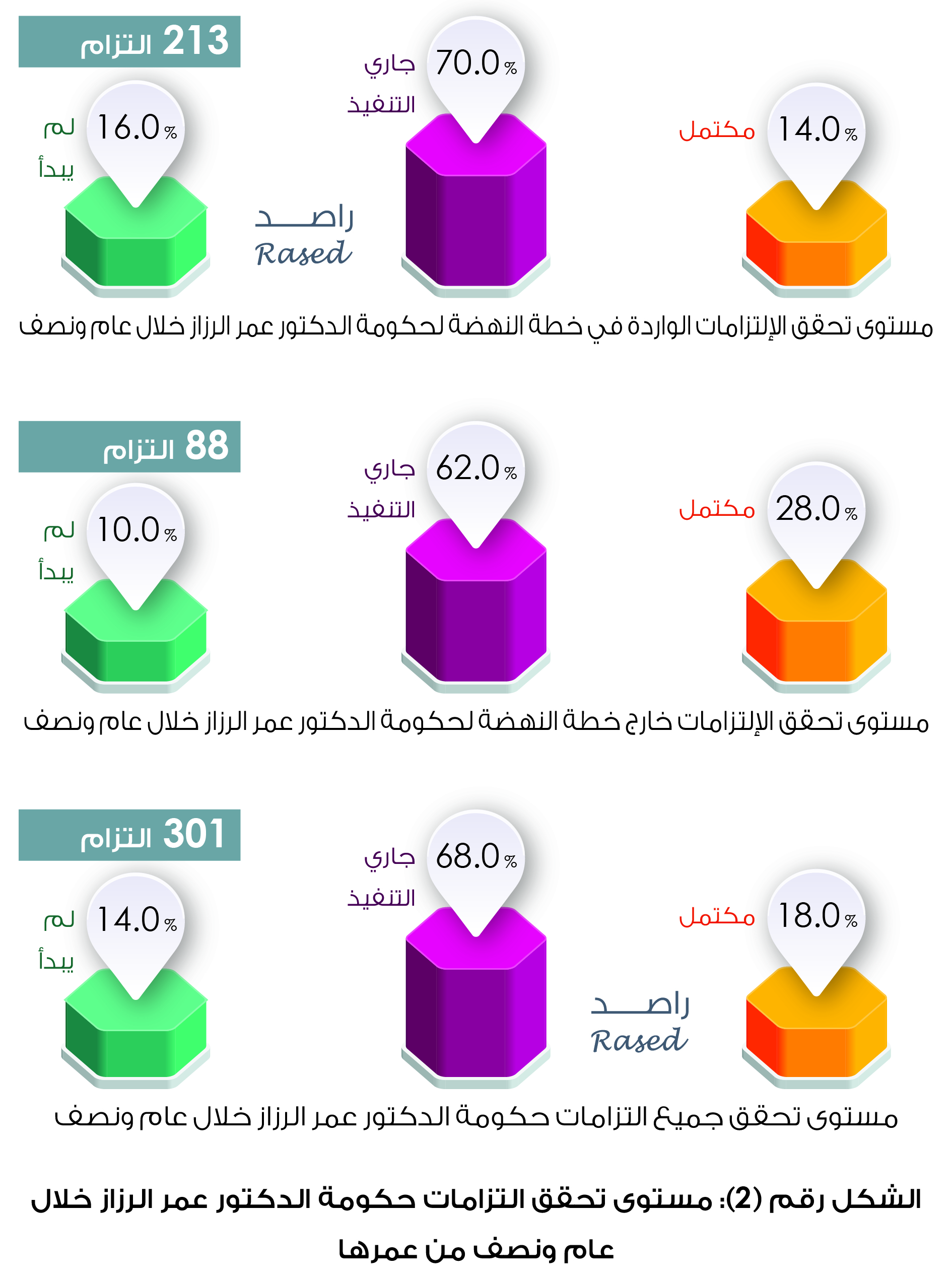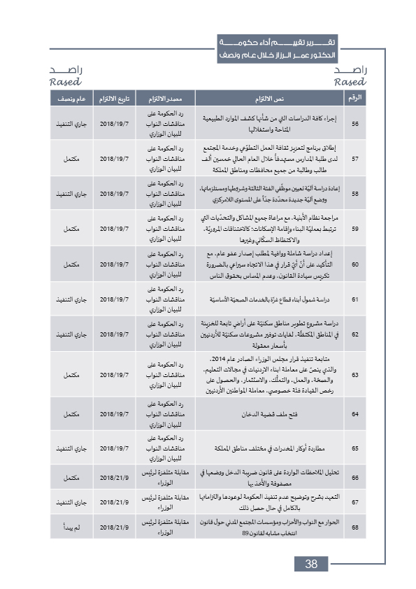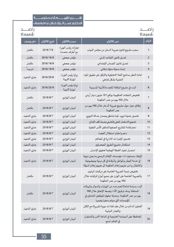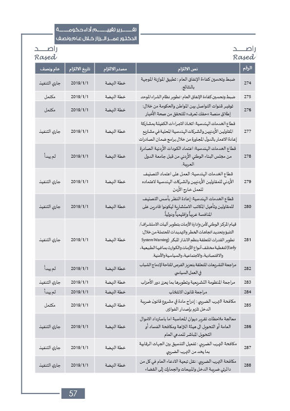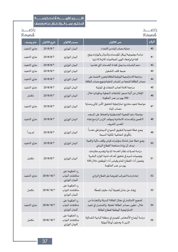 راصد:301 التزام التزمت بها حكومة الرزاز خلال عام ونصف اكتمل منها 18% و68% منها جاري العمل عليها