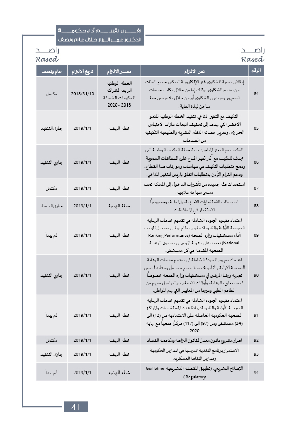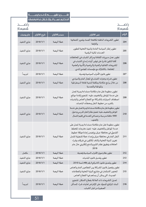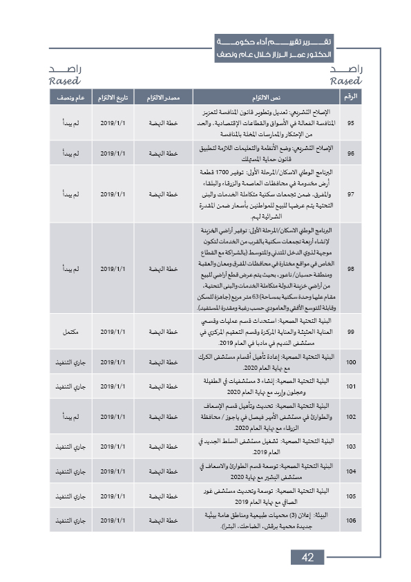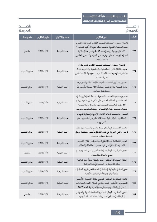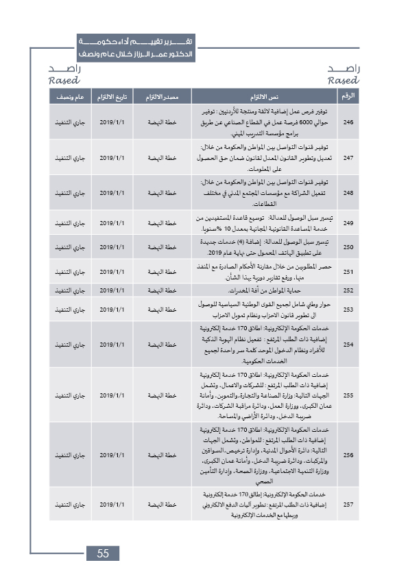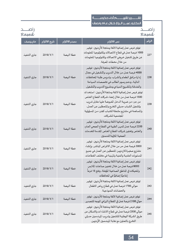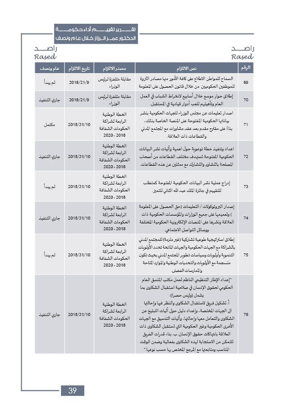 راصد:301 التزام التزمت بها حكومة الرزاز خلال عام ونصف اكتمل منها 18% و68% منها جاري العمل عليها
