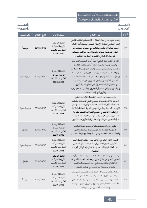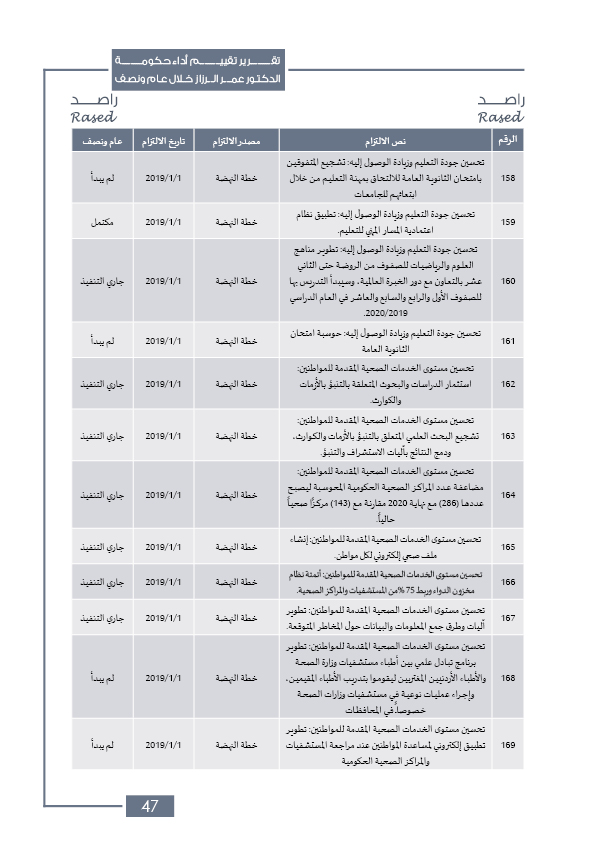 أطلق برنامج راصد لمراقبة الأداء الحكومي تقريره الخاص بمراقبة أداء حكومة الدكتور عمر الرزاز خلال عام ونصف من عمرها شملت الفترة ما بين 14/6/2018 ولغاية 14/12/2019، وتضمن التقرير تتبعاً للالتزامات الحكومية ومدى تنفيذها، وتتبعاً لقرارات مجلس الوزراء وتصنيفها لمحاور، ومتابعة سفر أعضاء مجلس الوزراء التي تم نشرها على الجريدة الرسمية، ومتابعة التعيينات التي أقرها مجلس الوزراء، كما عمل التقرير على تحليل لصفحة رئيس الوزراء على موقع "تويتر" خلال عام ونصف من حيث عدد التغريدات وتتبع مستوى تفاعل المواطنين وتوجهاتهم من خلال جمع ومراجعة وتحليل التعليقات والاعجابات وإعادة التغريد، كما أضاف التقرير محوراً خاصاً بالتشريعات التي نشرت في الجريدة الرسمية منذ تولي الحكومة سلطاتها الدستورية.
