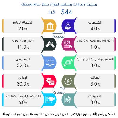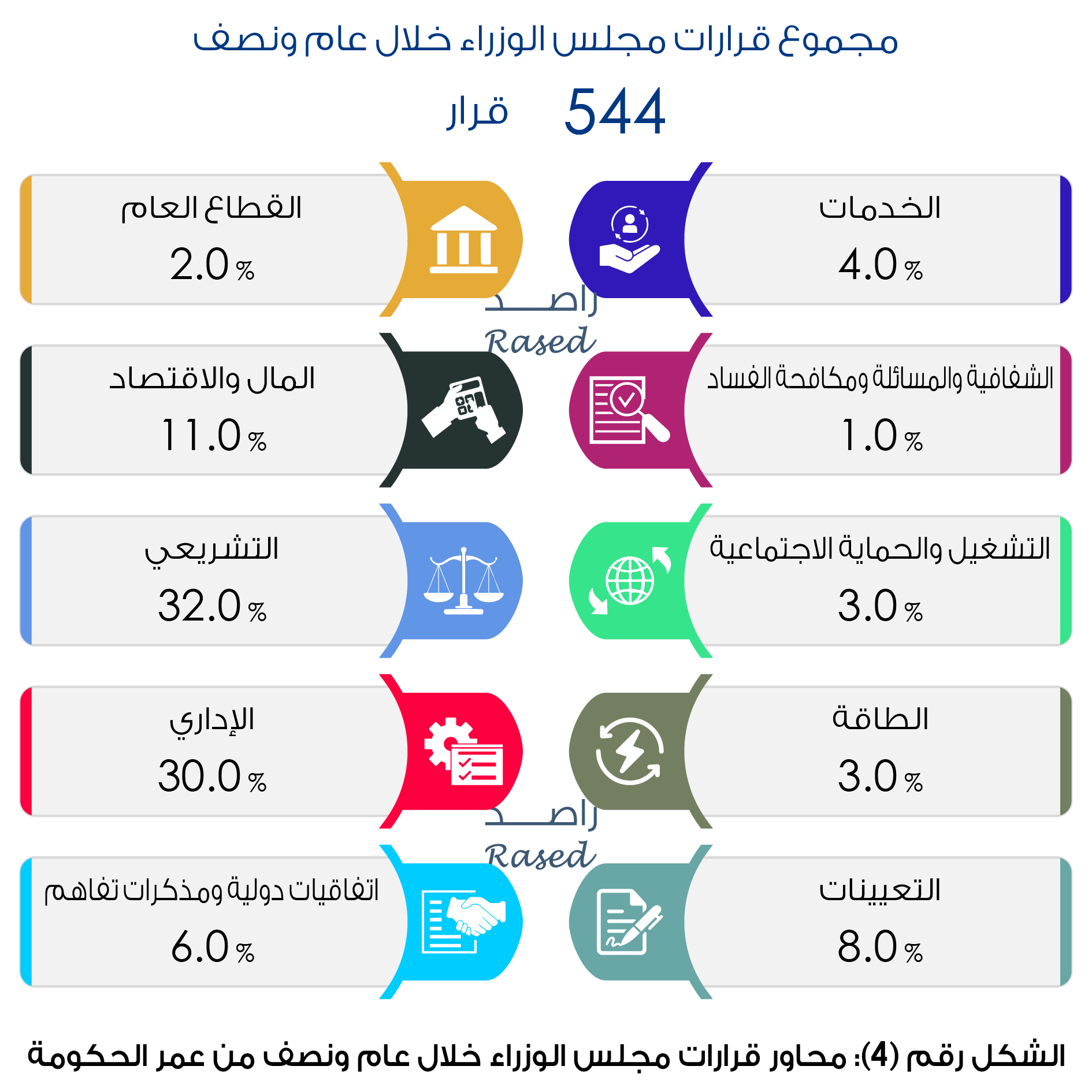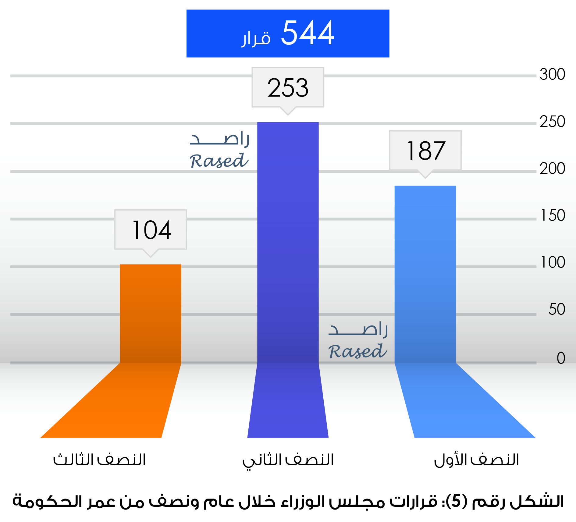 544 قراراًأصدرها مجلس الوزراء خلال عام ونصف 32% منها تتعلق بالمحور التشريعي و30% بالمحور الإداري