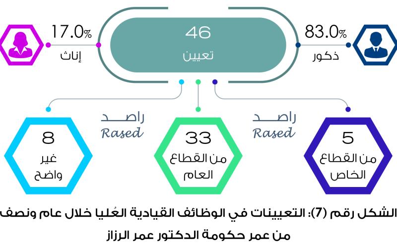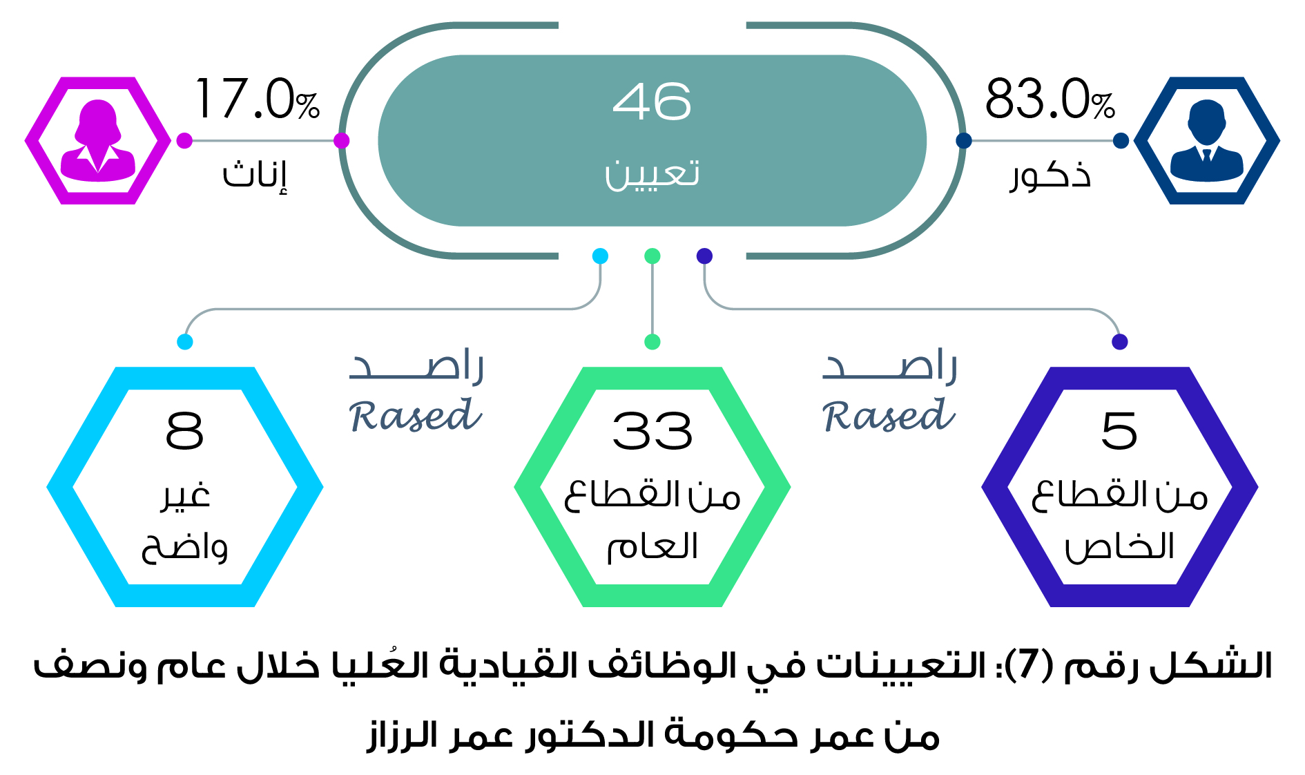 وبينت النتائج أن مجلس الوزراء أصدر 46 قرار تعيين في مناصب قيادية وعامة 83% منها حظي بها الذكور و17% للاناث وبتحليل السياق الوظيفي السابق للمعينين يتبين أن 5 أشخاص منهم قدموا من القطاع الخاص و33 شخص كانوا قد عملوا أو على رأس عملهم في القطاع العام.