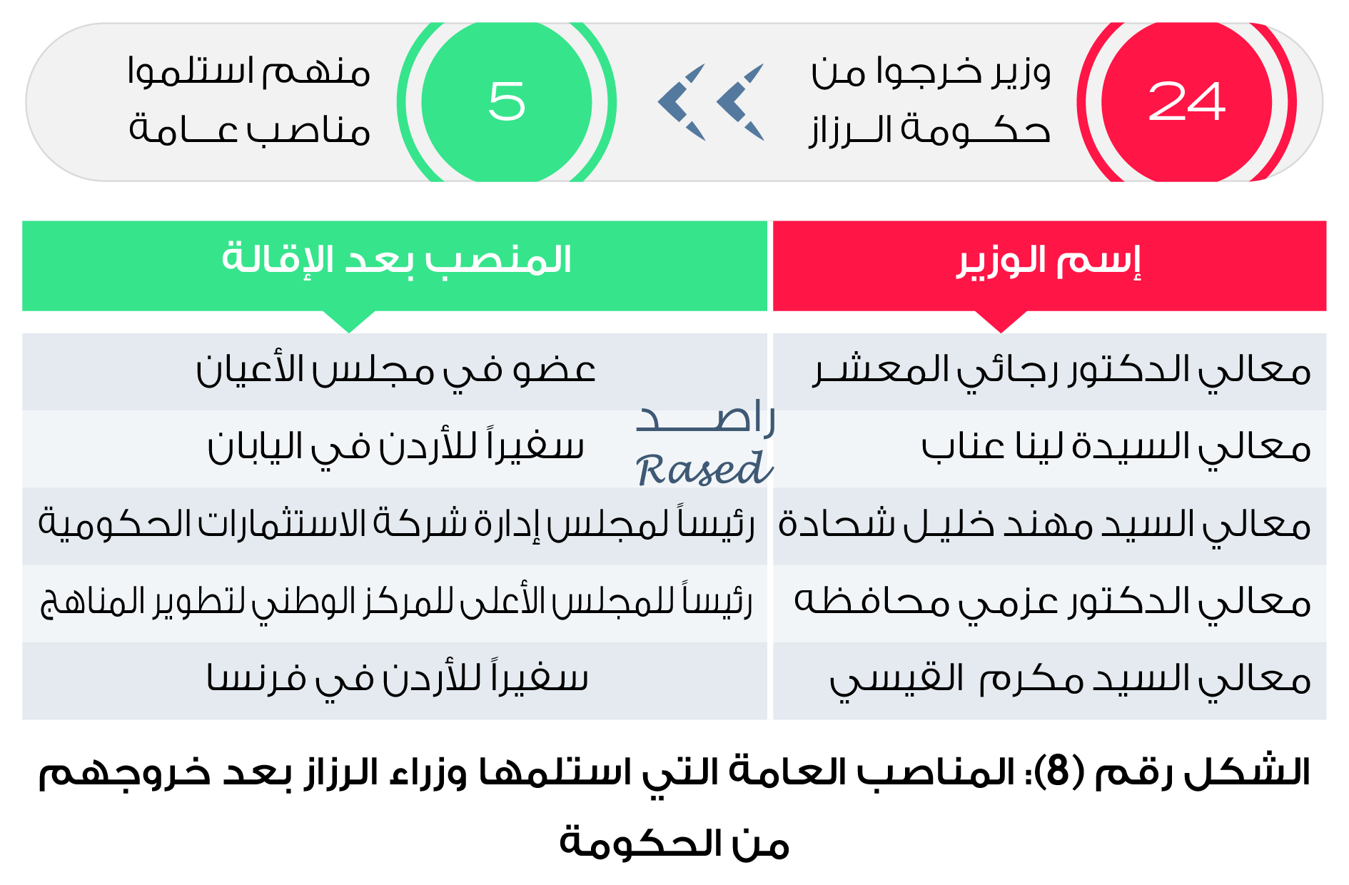 21% من الوزراء الذين غادروا حكومة الرزاز تم تعيينهم بمناصب عامة بعد مغادرتهم.