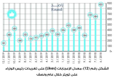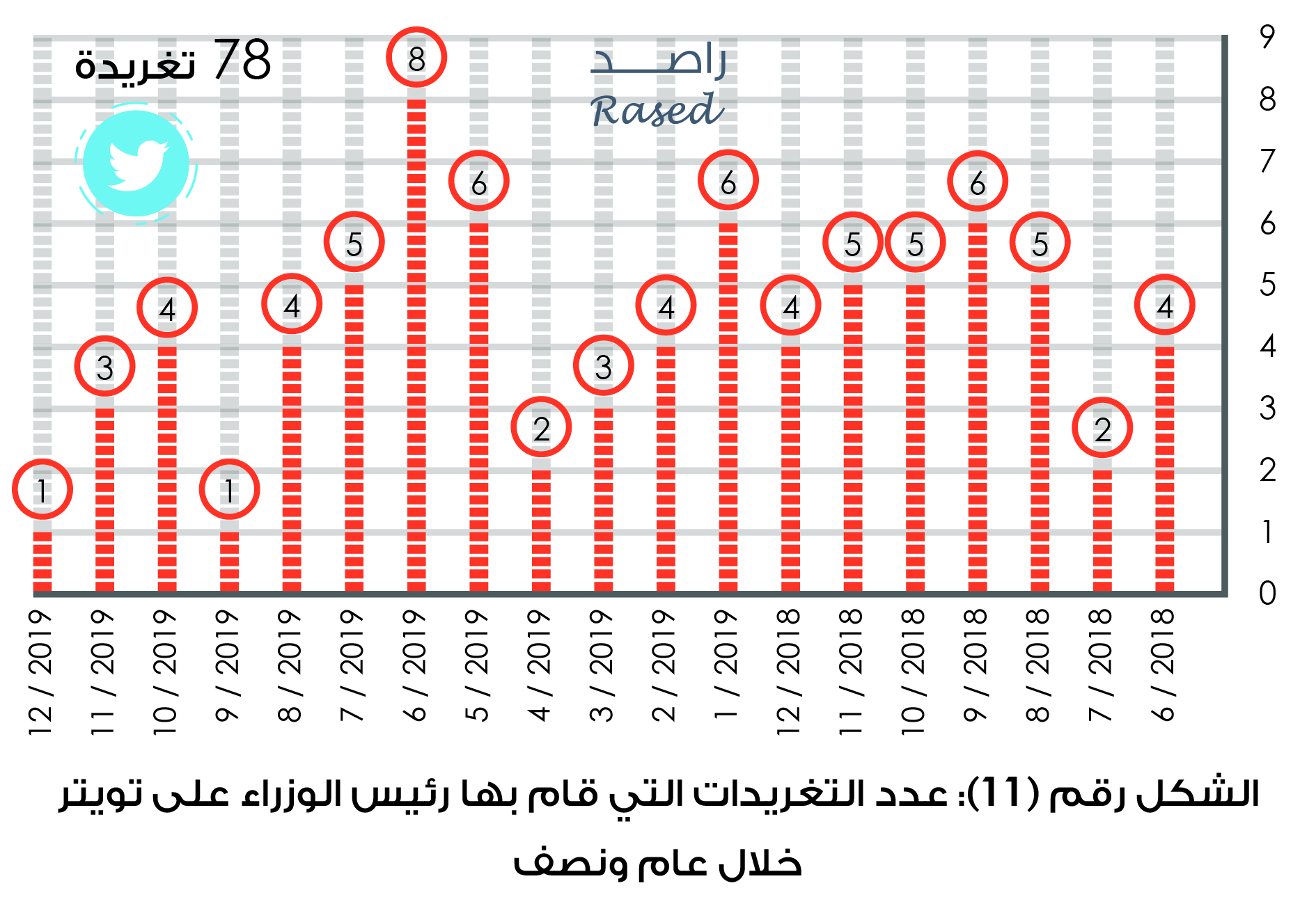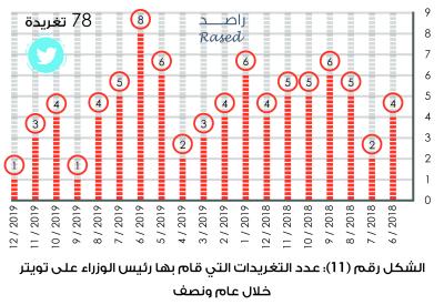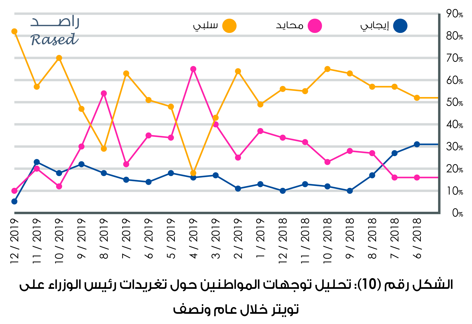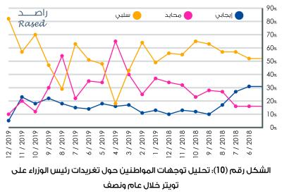 كما عمل فريق التقرير على تتبع الصفحة الرسمية لرئيس الوزراء عبر موقع تويتر وتحليلها حيث بينت النتائج انخفاض مستوى التعليقات ذات الطابع الإيجابي على تغريدات رئيس الوزراء بشكل ملموس من 31% في الشهر الأول لتوليه سلطاته الى 1% في شهر 12/2019 فيما ارتفعت نسبة التعليقات ذات الطابع السلبي من 52% الى ما يزيد عن 82%.