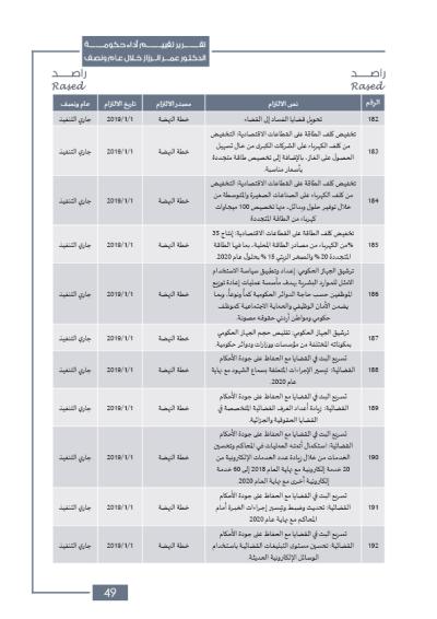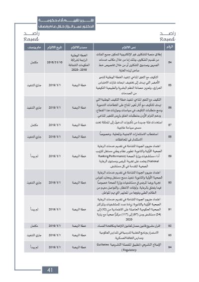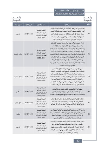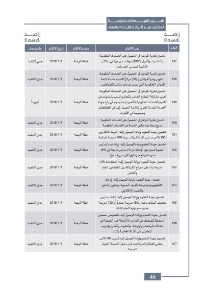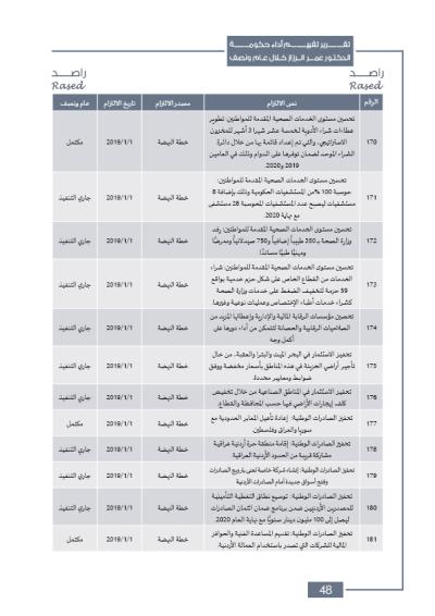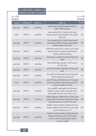 وقال بني عامر أن التقرير أظهر أن الحكومة التزمت ب 301 التزام خلال عام ونصف عمل فريق التقرير على حصرها من مصادر متعددة ابتداءً من البيان الحكومي الذي تم تلاوته في مجلس النواب لكسب الثقة ورد الحكومة على النواب وصولاً الى خطة أولويات الحكومة 2019-2020 إضافة لتتبع الالتزامات الواردة على لسان رئيس الحكومة في اللقاءات الاعلامية والزيارات الميدانية.