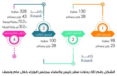 وعلى صعيد رحلات سفر أعضاء مجلس الوزراء فقد أظهر التقرير أن 43 وزيراً سافروا 328 رحلة سفر خلال عام ونصف من عمر الحكومة 70% منها معلنة الوجهة و30% غير معلنة دون معرفة أسباب السفر ومخرجاته، وهنا لا بد من التأكيد على أن المعلومات الخاصة بسفر الوزراء تم استخلاصها من الجريدة الرسمية.