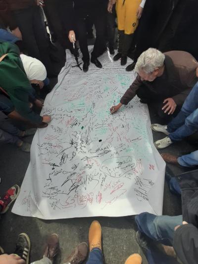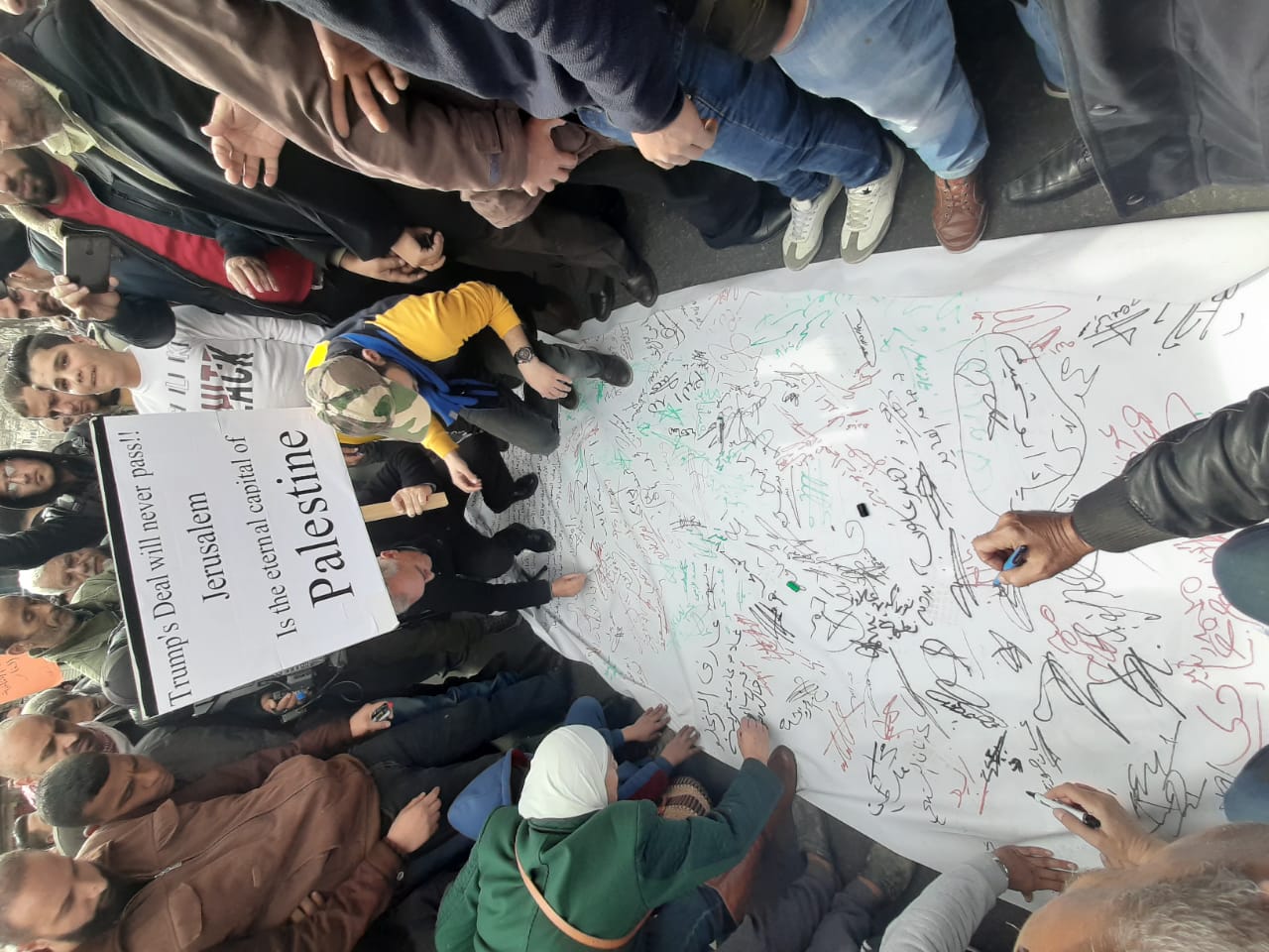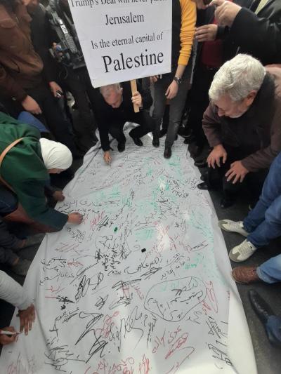 كما رفعوا شعارات ترفض تصفية القضية الفلسطينية وإلغاء حق العودة، وترفض مزيدا من التوسع على حساب أراضي الضفة الغربية، مشددين في الوقت ذاته على أن أرض فلسطين كاملة من النهر إلى البحر.